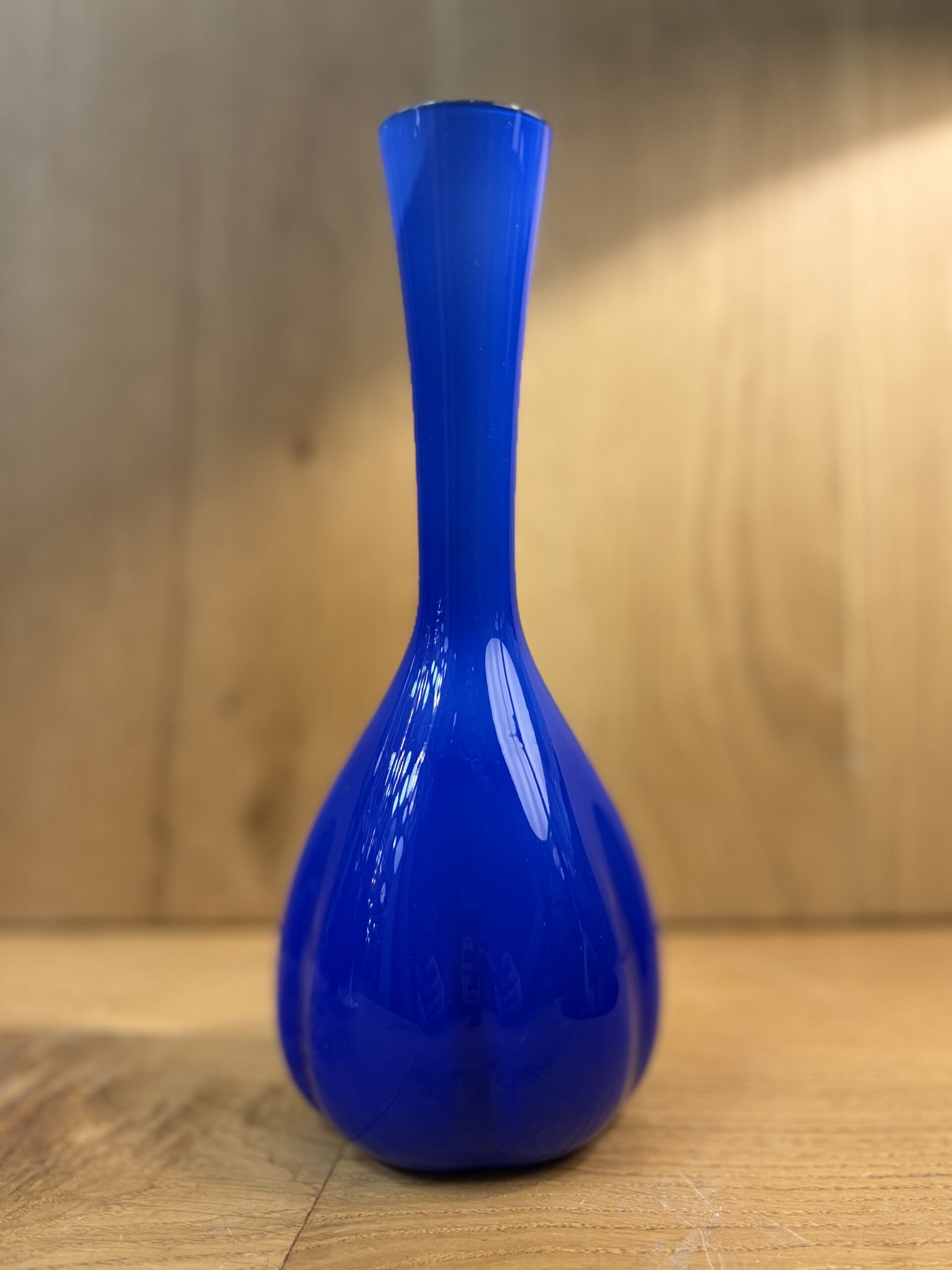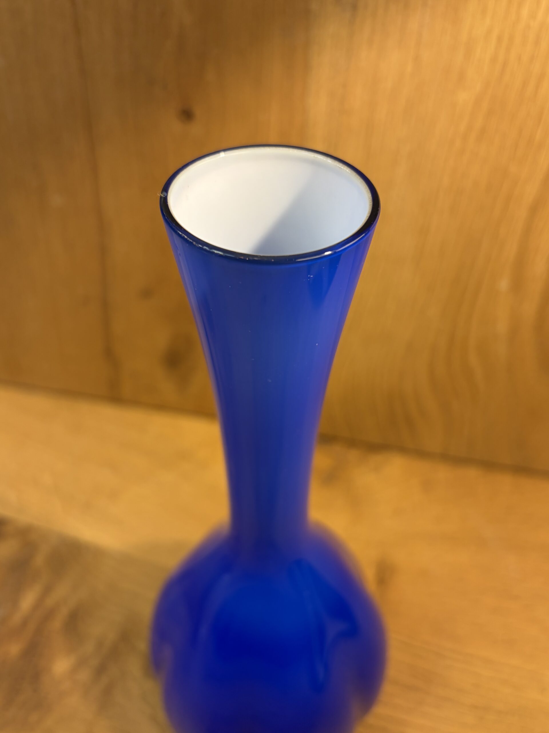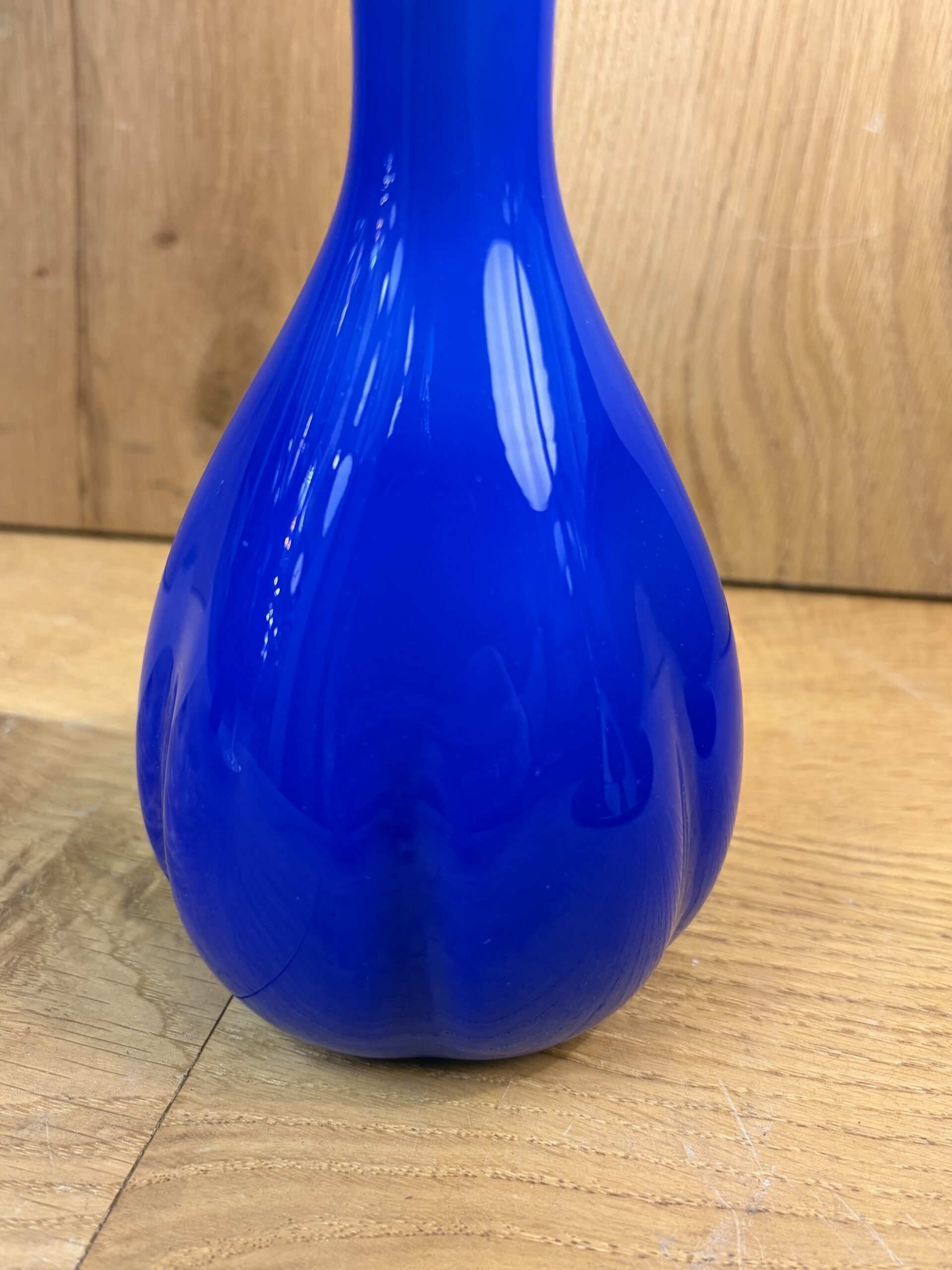 Designed by Gunnar Ander for Elme Glasbruk, this melon-form vase cased in colbalt blue is a beautiful piece of glasswork and shows design details of the time, with a white inside which was typical for the Elme pieces. A fantastic piece of design history.
