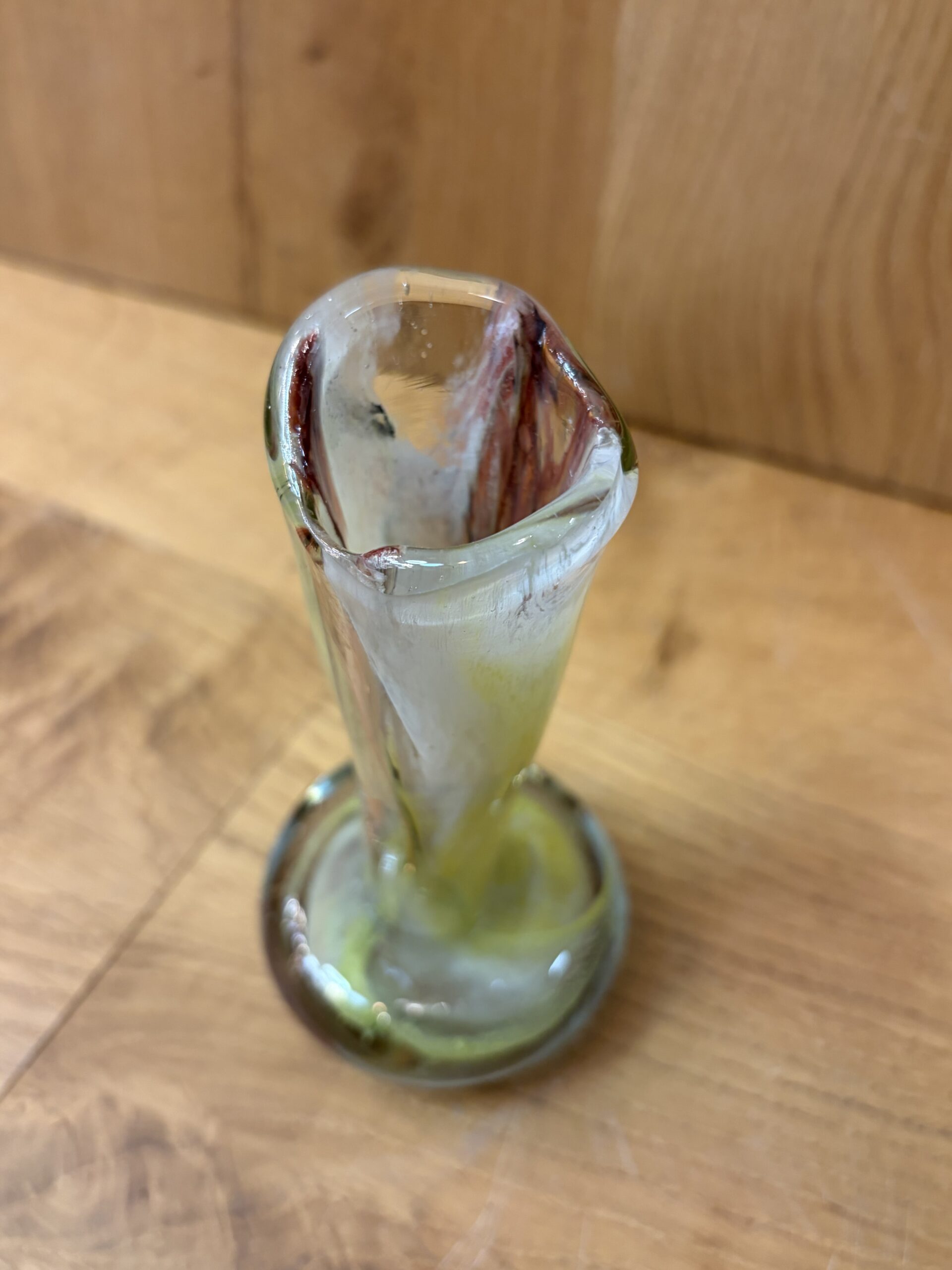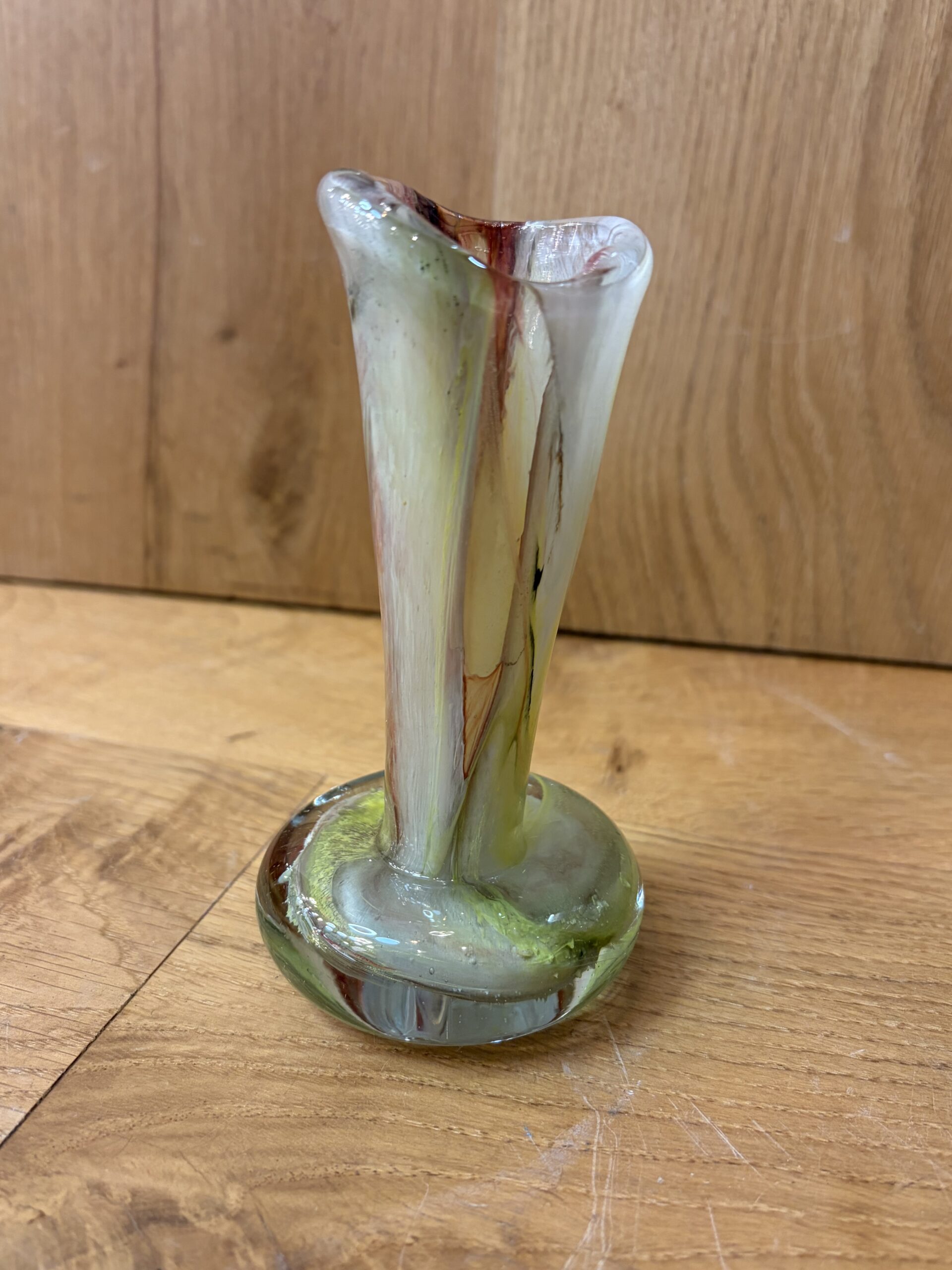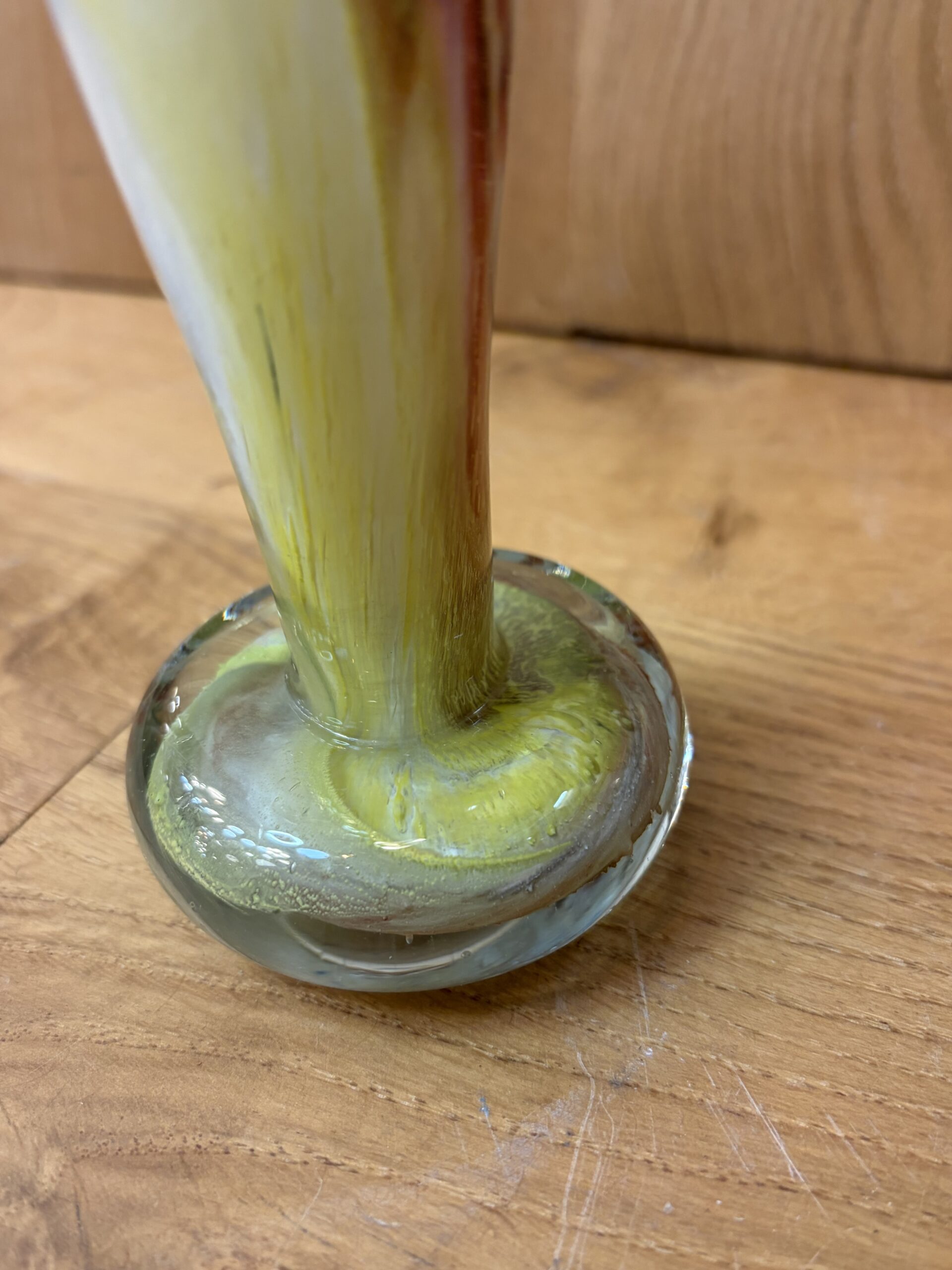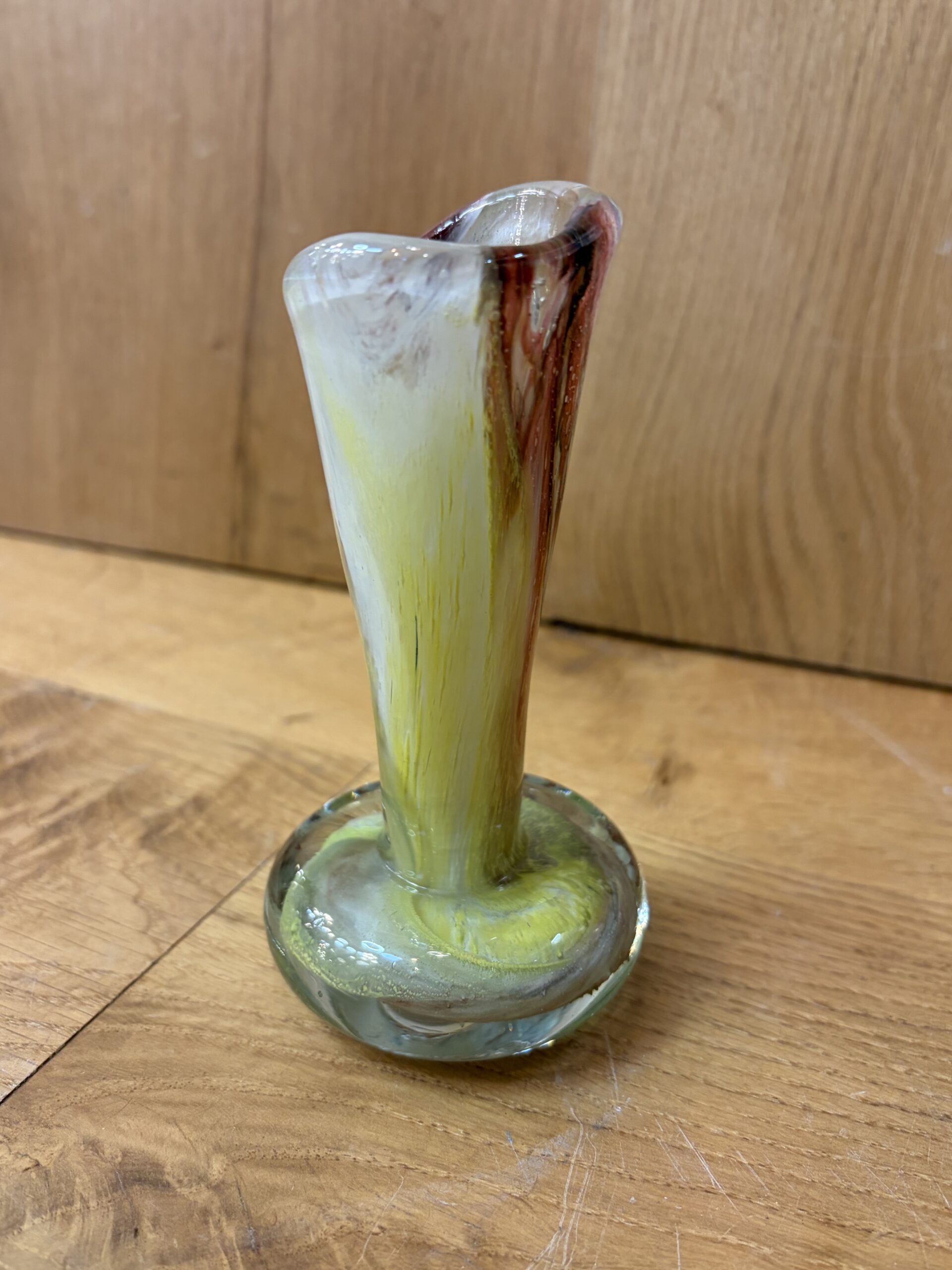 A beautiful hand-blown art glass vase, commonly referred to as a “swirl” or “spatter” vase, featuring yellow, red, and white coloration with a clear, rounded base and a ruffled rim. The distinctive style is characteristic of mid-century modern designs, particularly those from the 1960s and 1970s.
