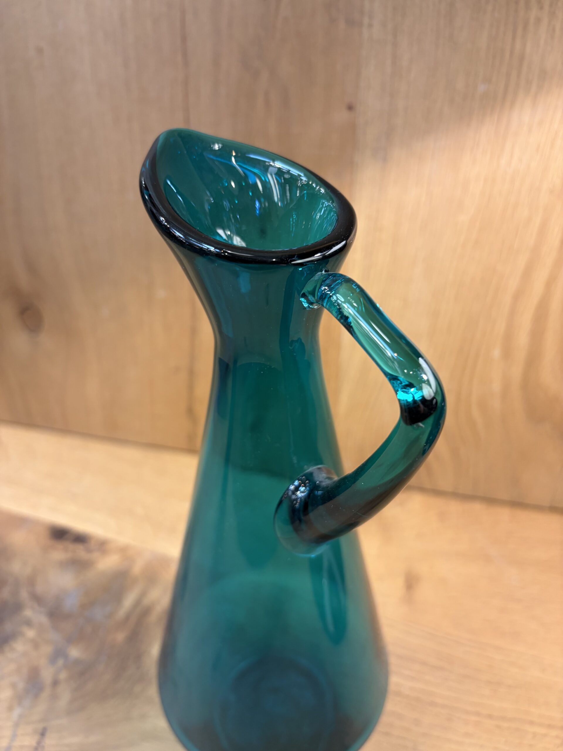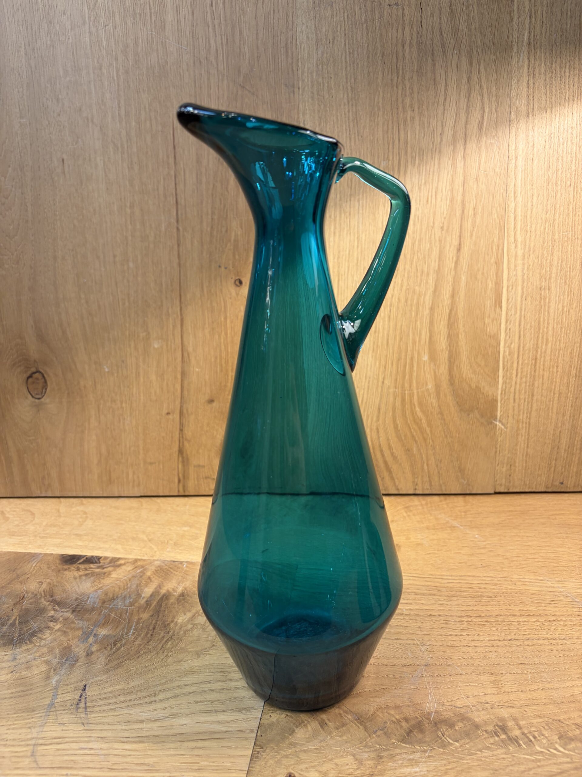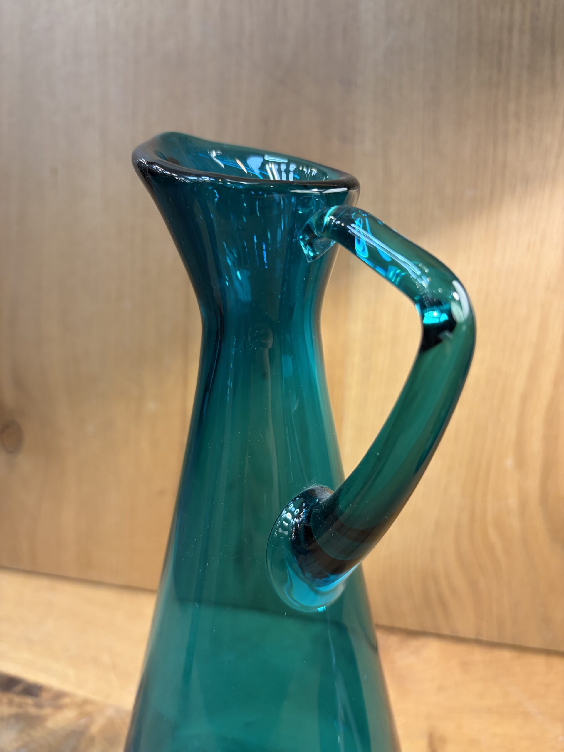 This is a mid century aged glass pitcher shaped jug, in a striking teal colour.