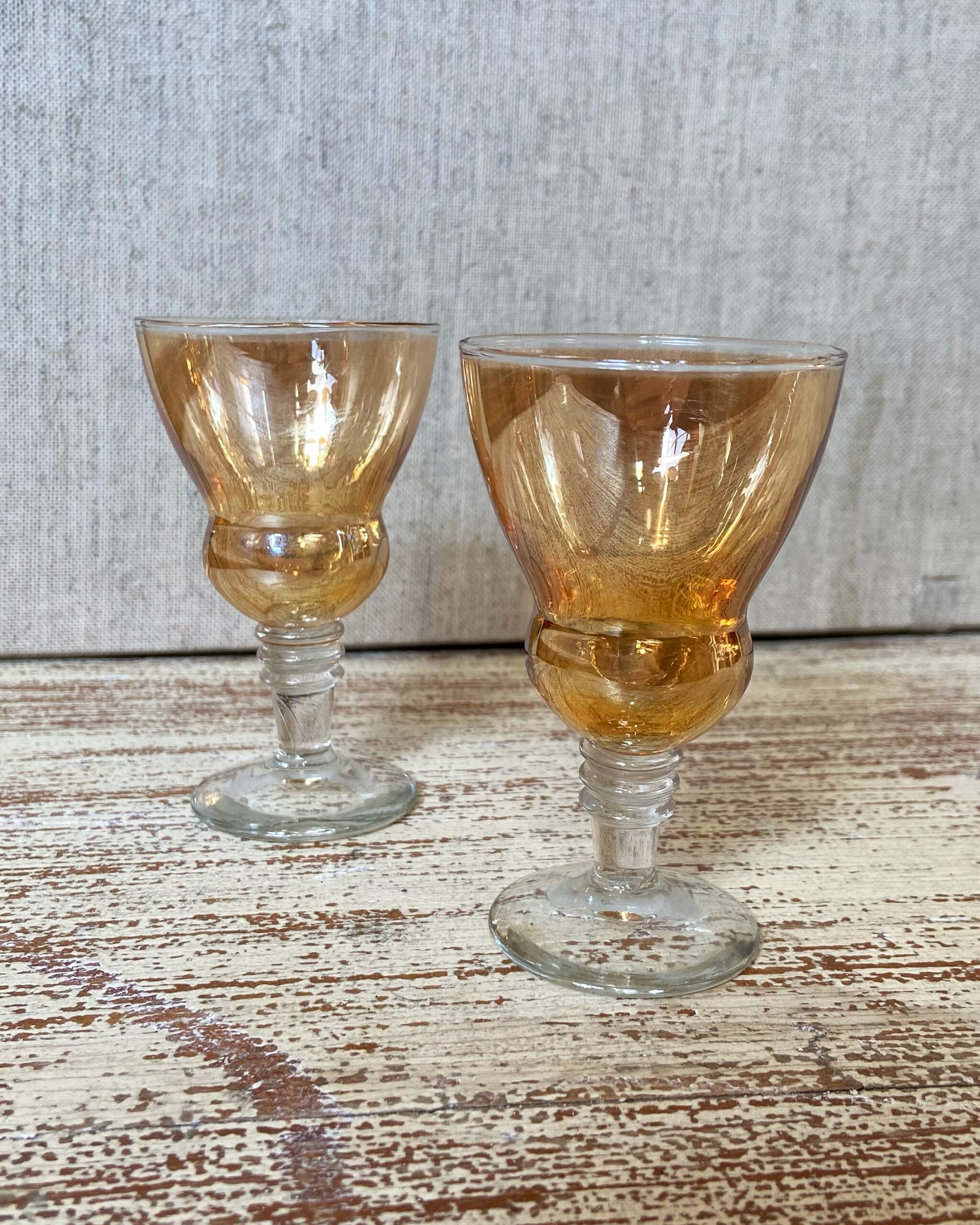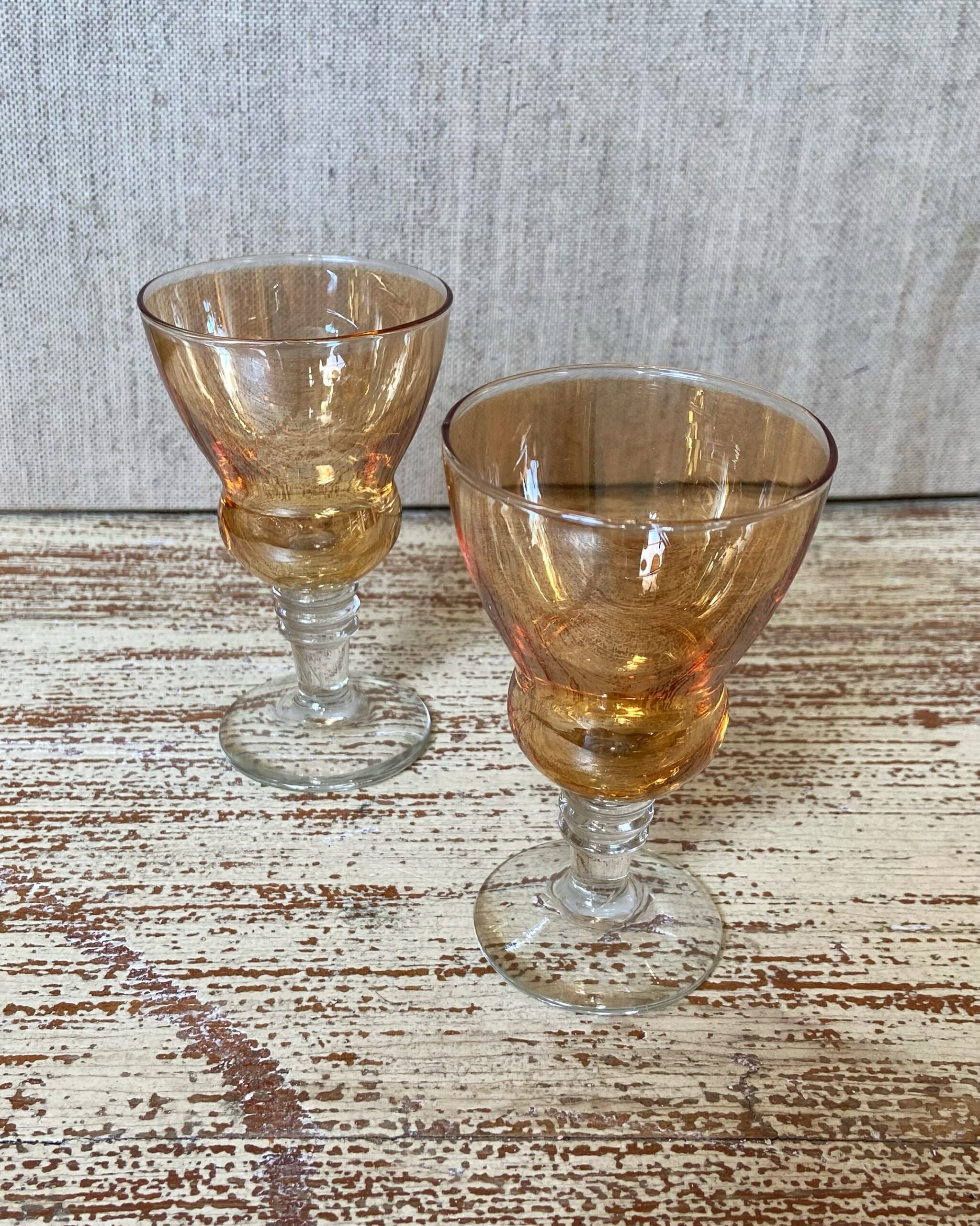 This pair of vintage aperitif glasses feature a warm amber bowl with a clear, decorative stem. Perfect for serving sherry, port, or liqueurs, they add a sophisticated touch to any barware collection.