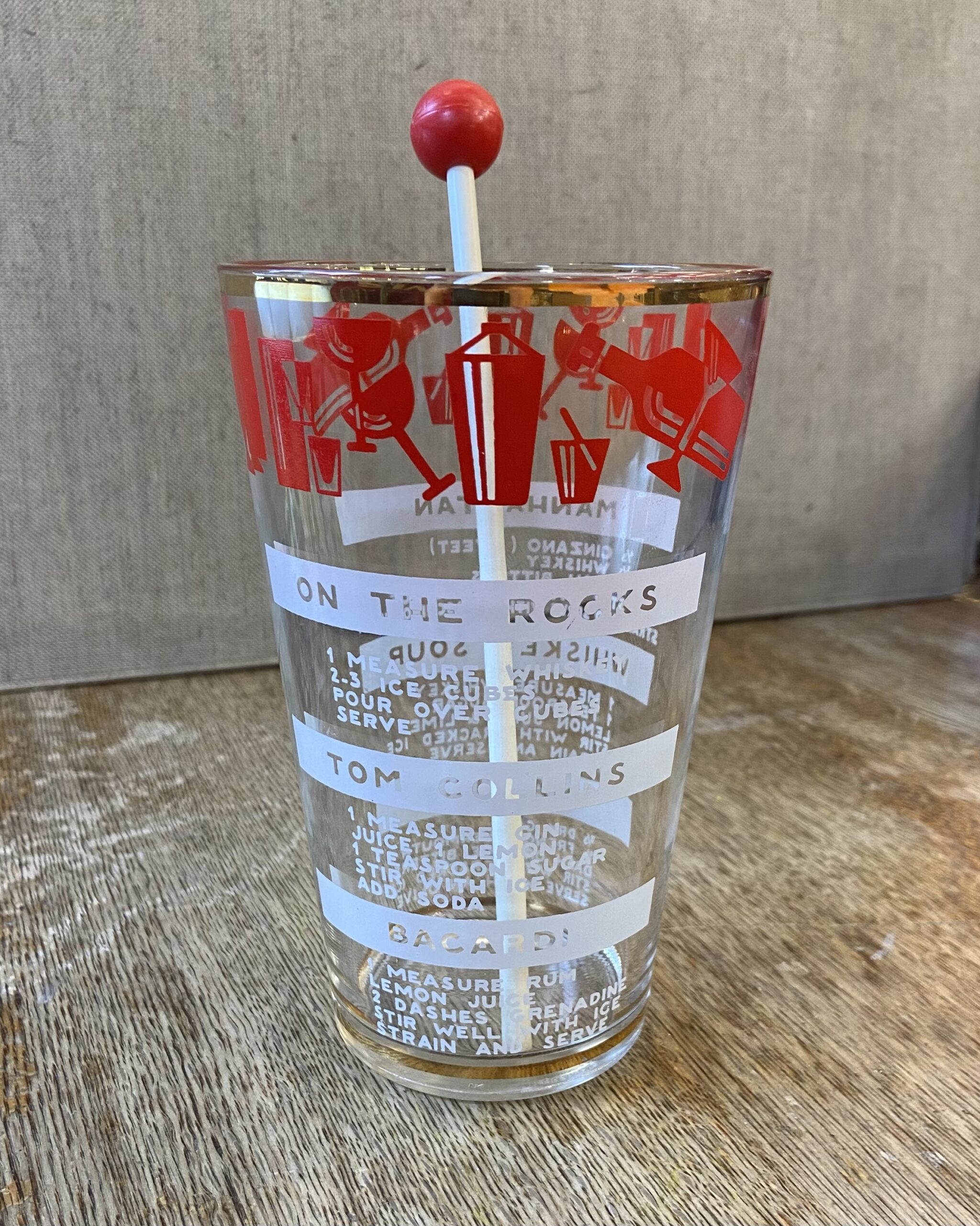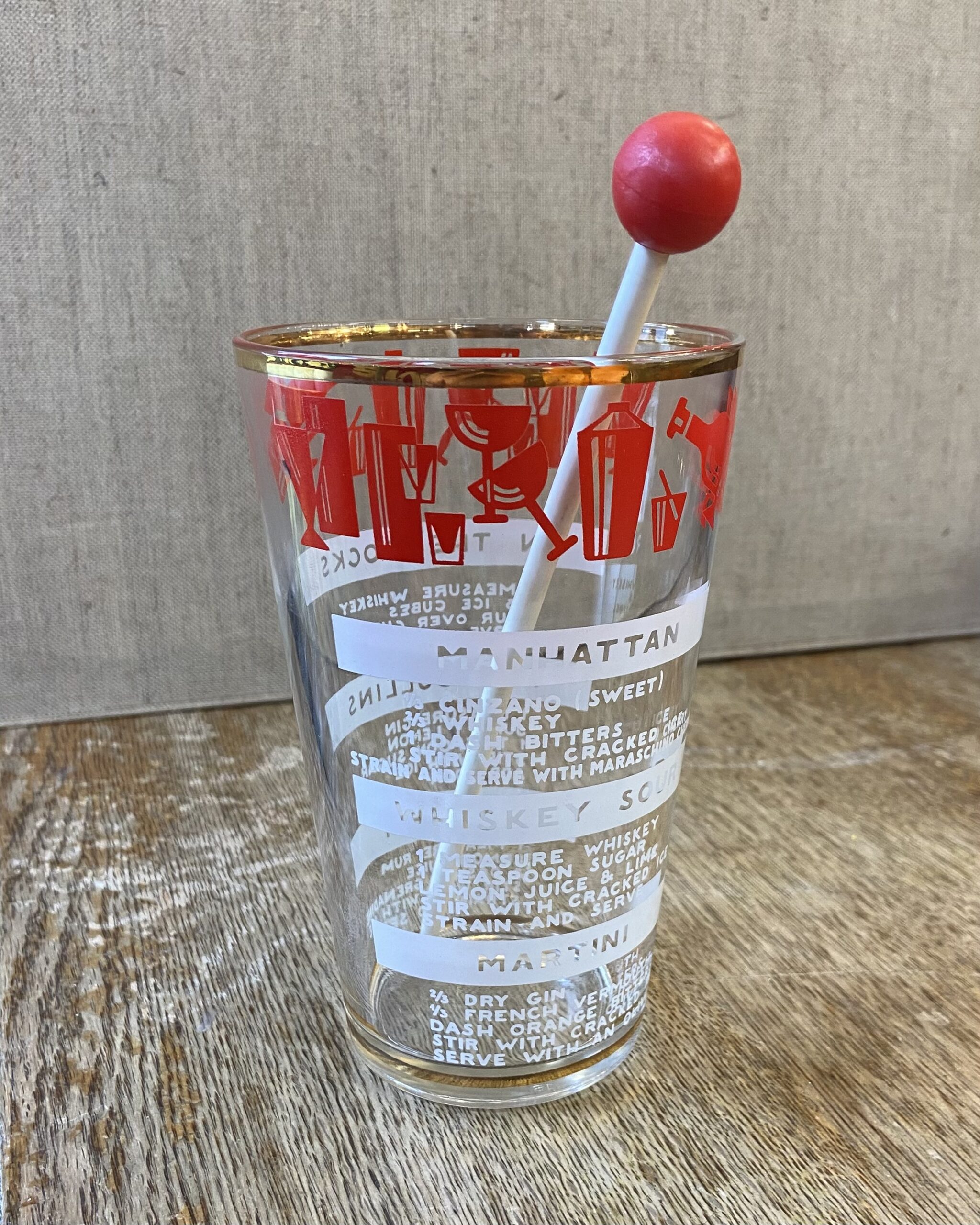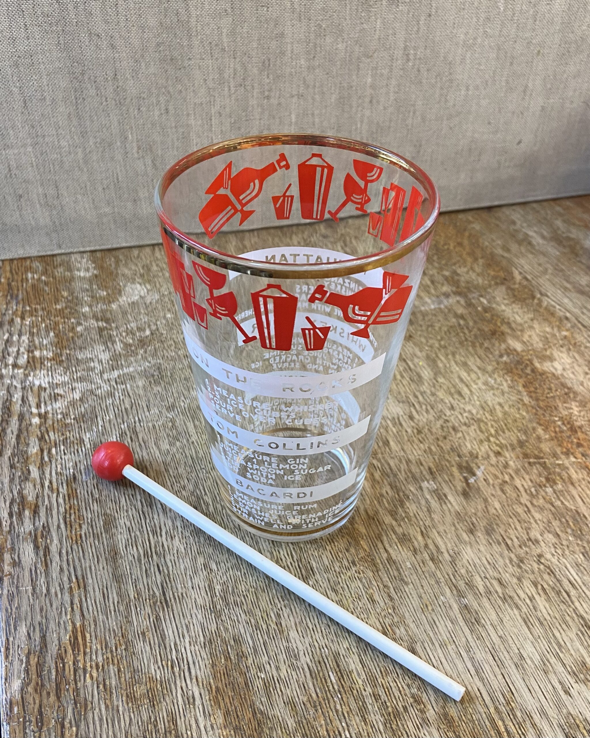 A Mid Century cocktail making glass, with stirrer. With classic cocktail recipes printed in white and drink illustration designs printed around the top of the glass.