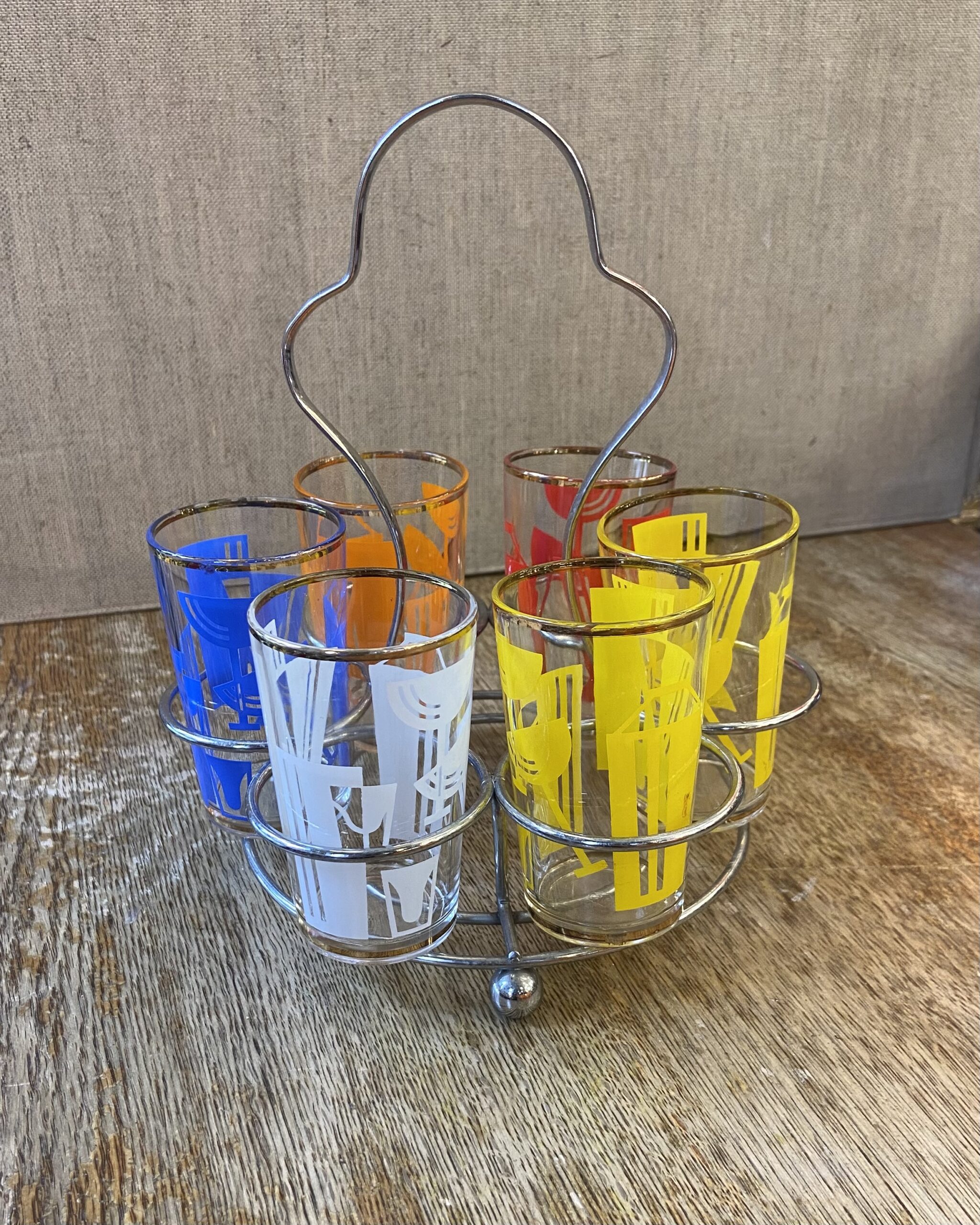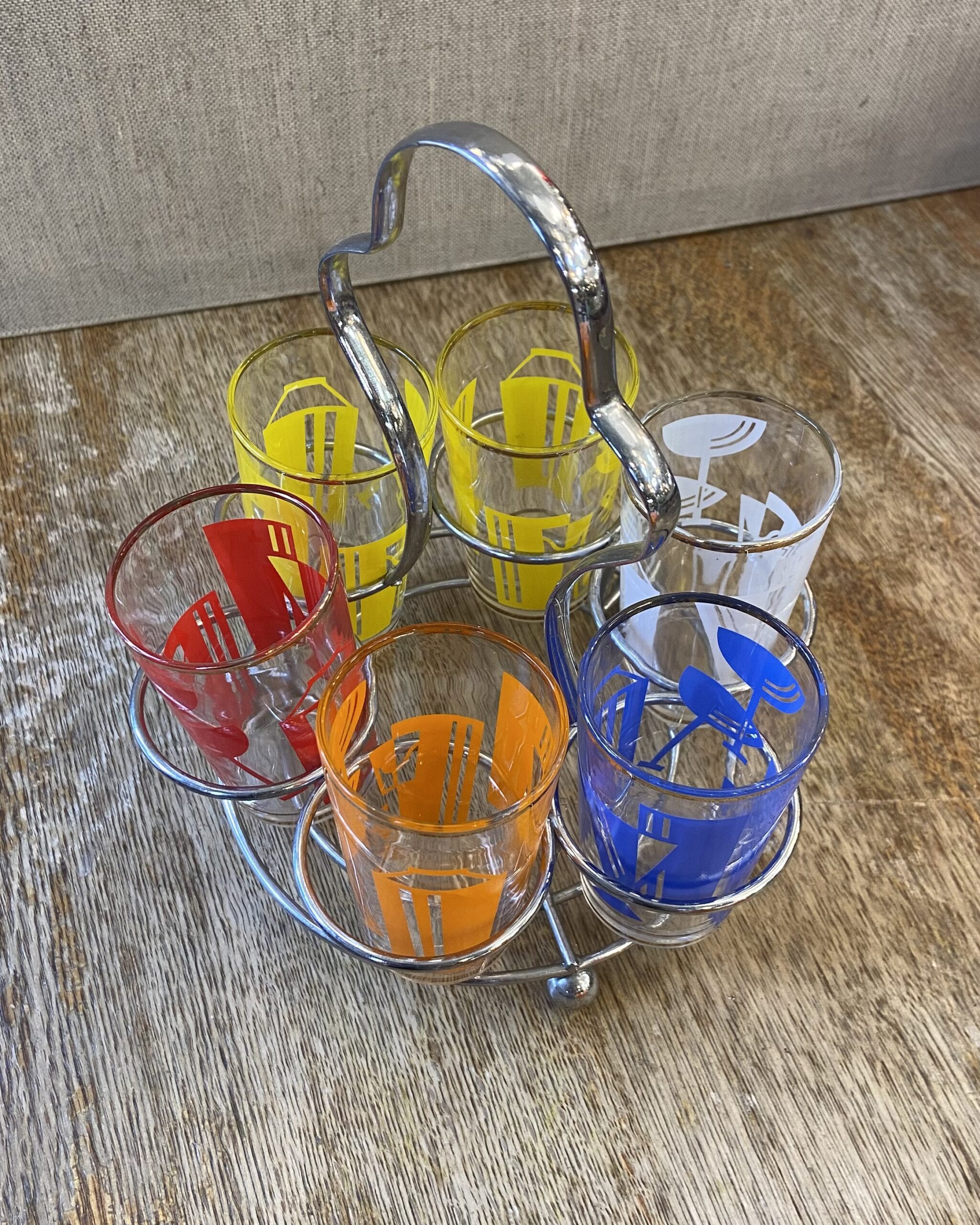 This set of 6 mid century shot glasses have bright, retro designs of drinks glasses on each of the glasses, in white, yellow, blue, orange and red. With a metal caddy to hold each glass.