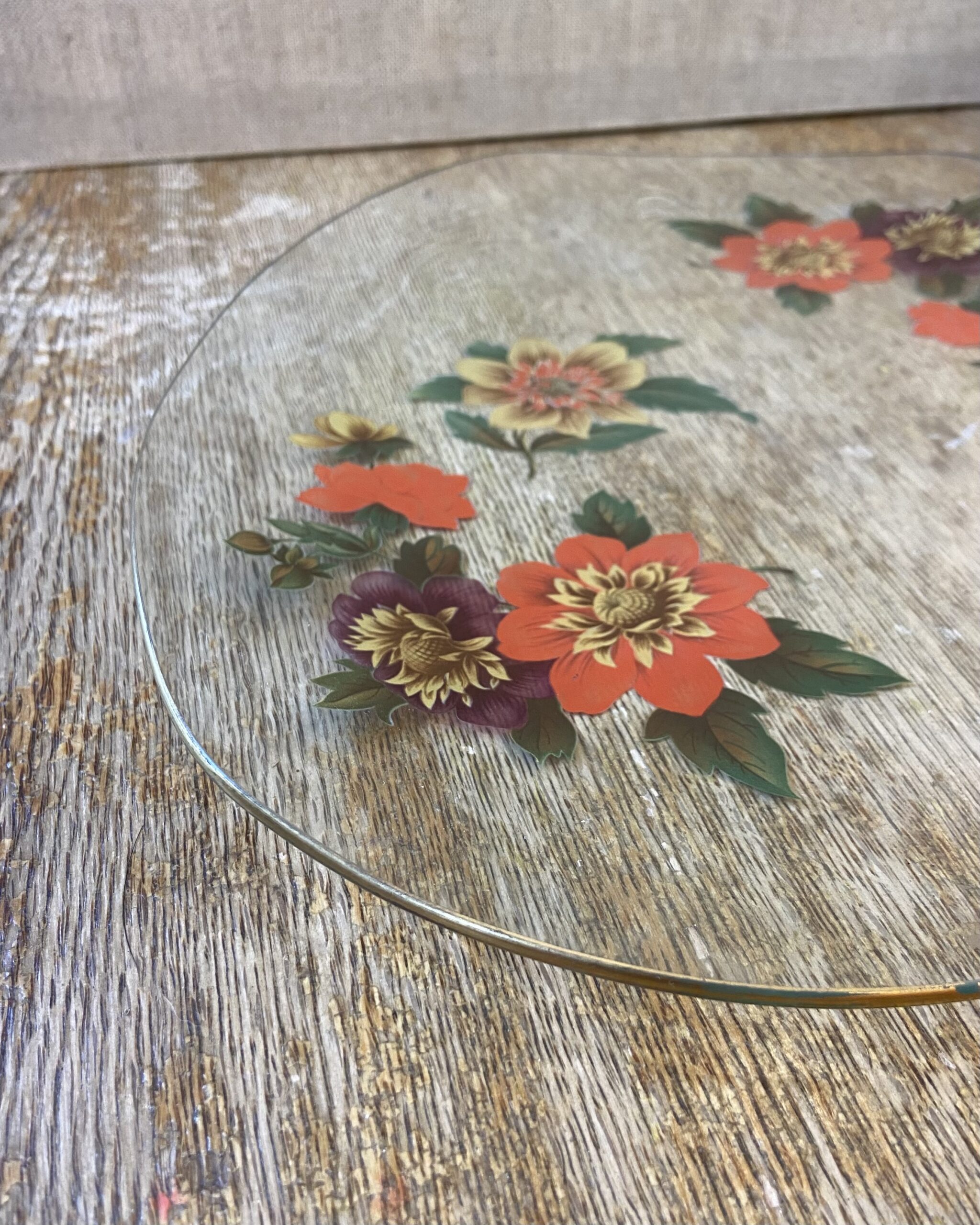 This is a beautiful mid century Chance Glass tray, featuring printed floral patterns and a gilt edge.