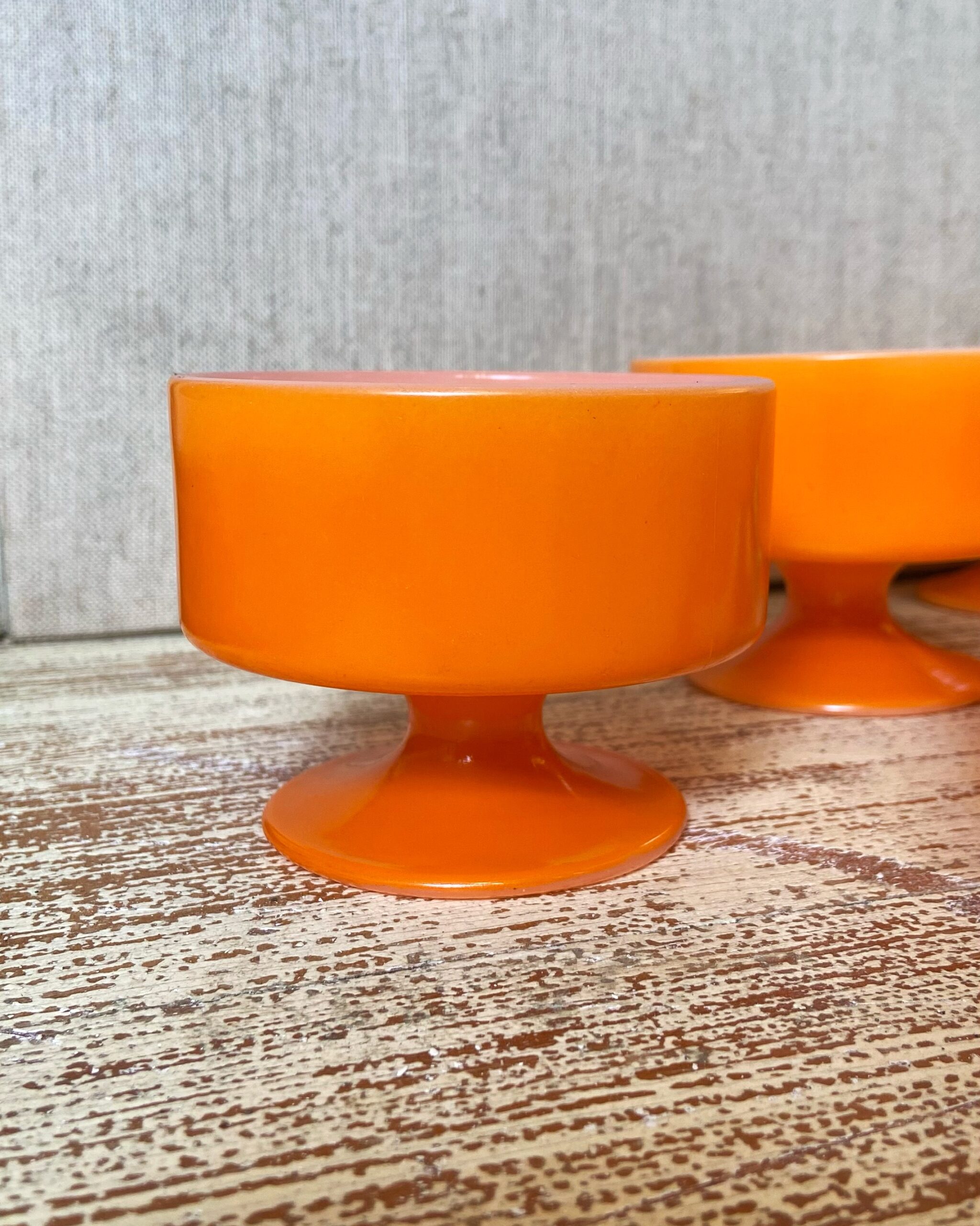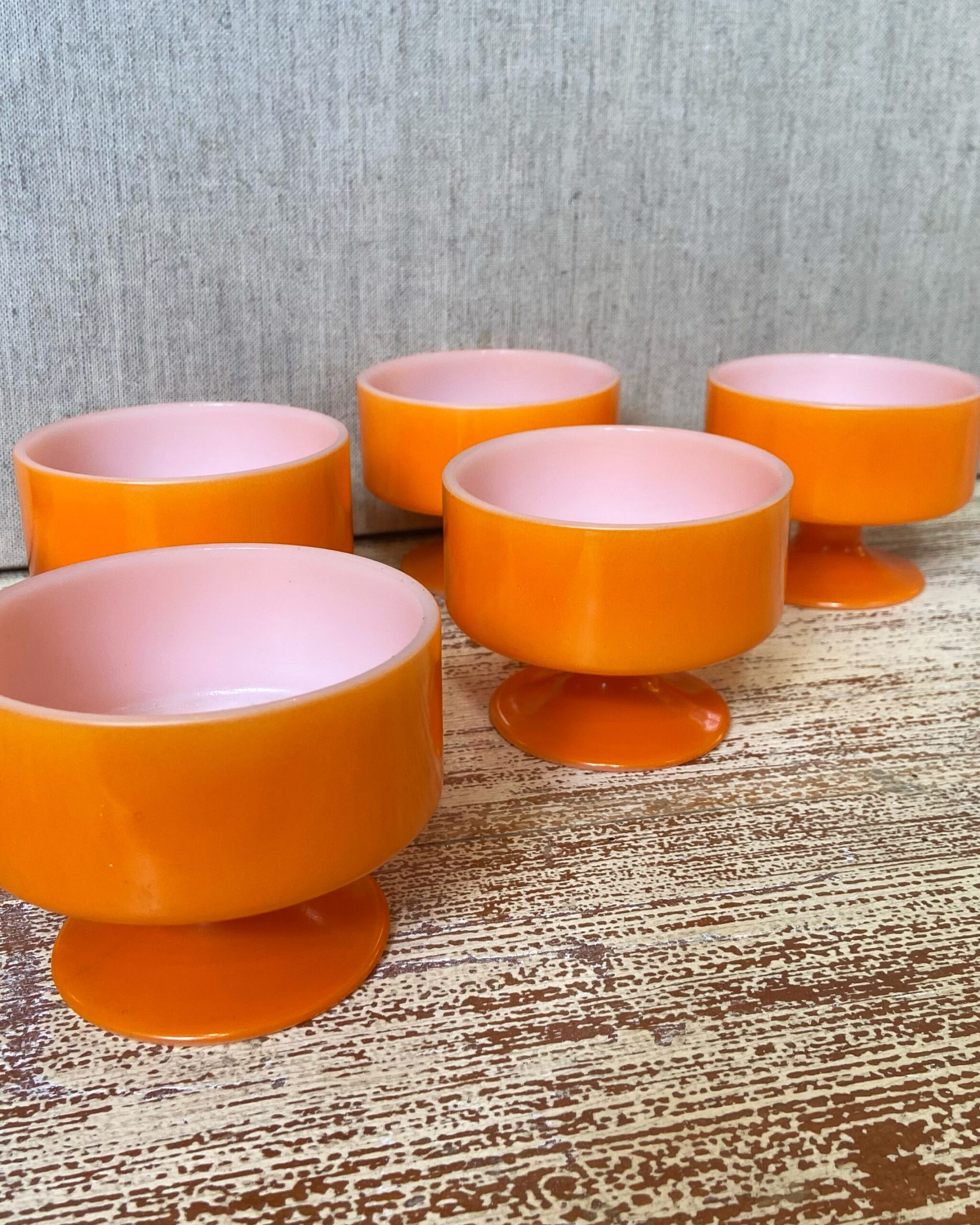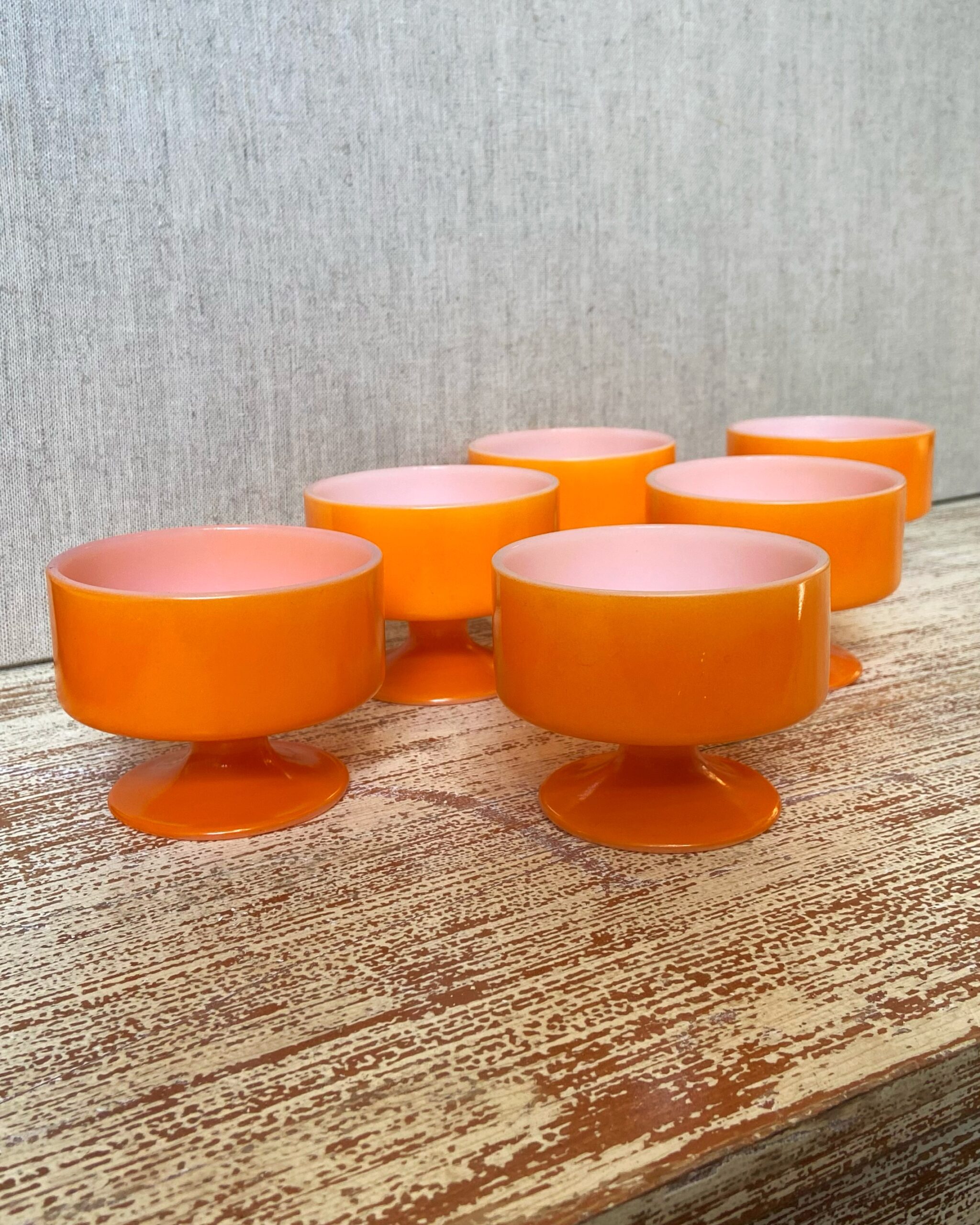 Bold and retro, these mid-century federal glass dessert bowls feature an orange exterior with a white interior. Perfect for ice cream or fruit, they add a fun pop of color to any table or vintage collection.