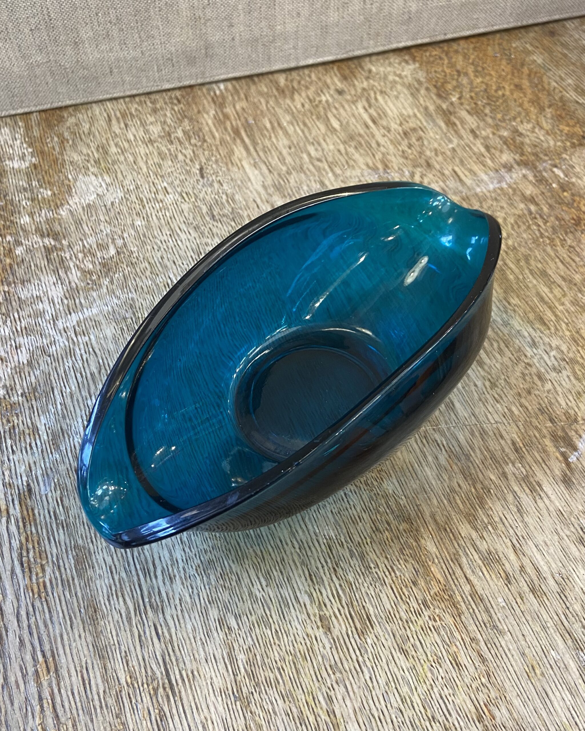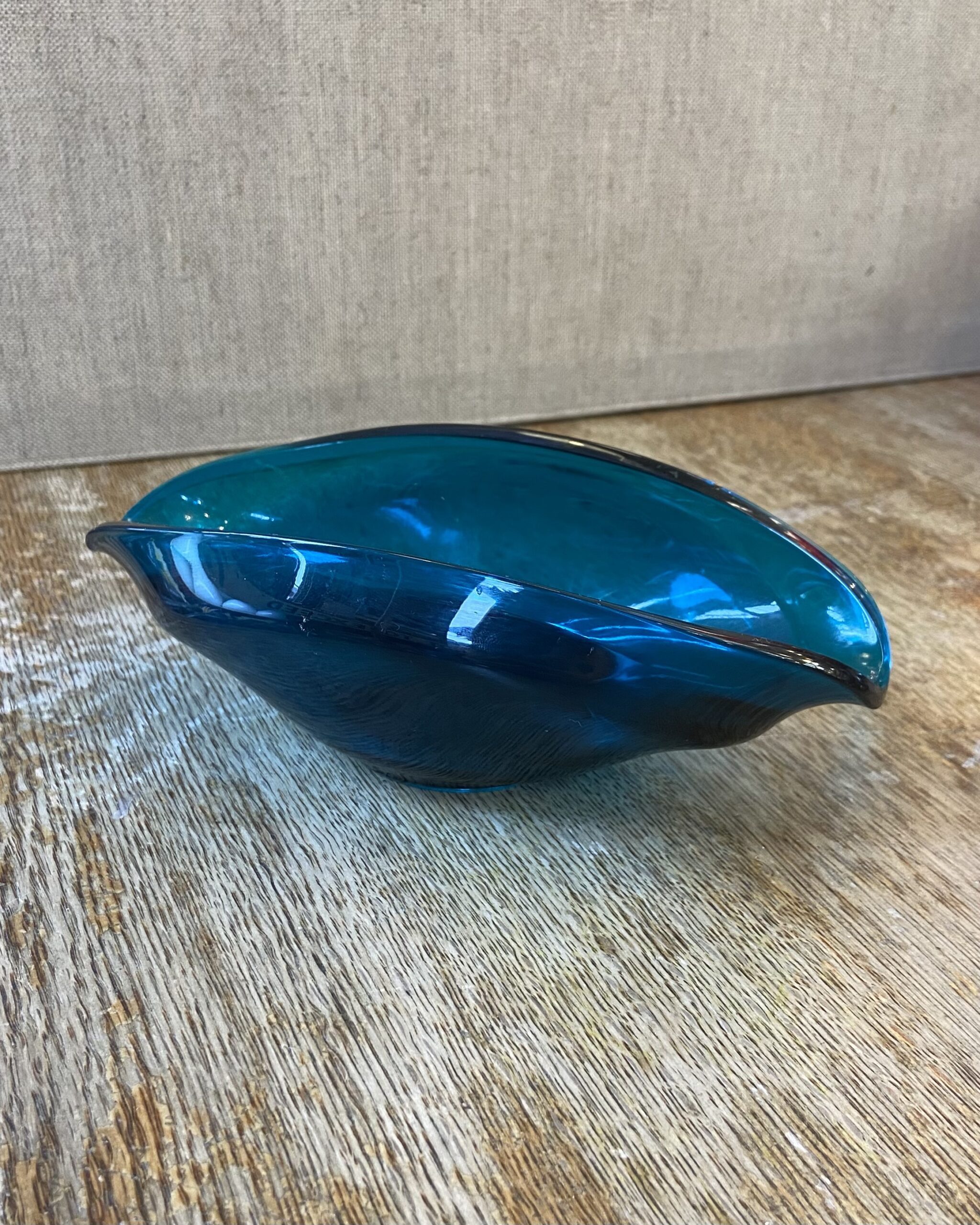 Mid Century Murano style glass ashtray in teal coloured glass with curved features.