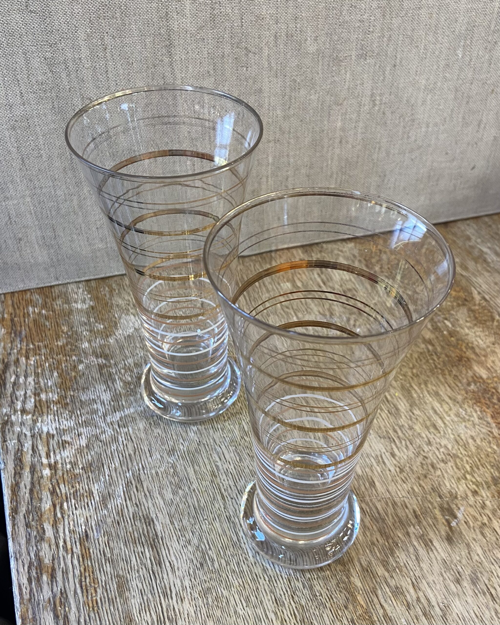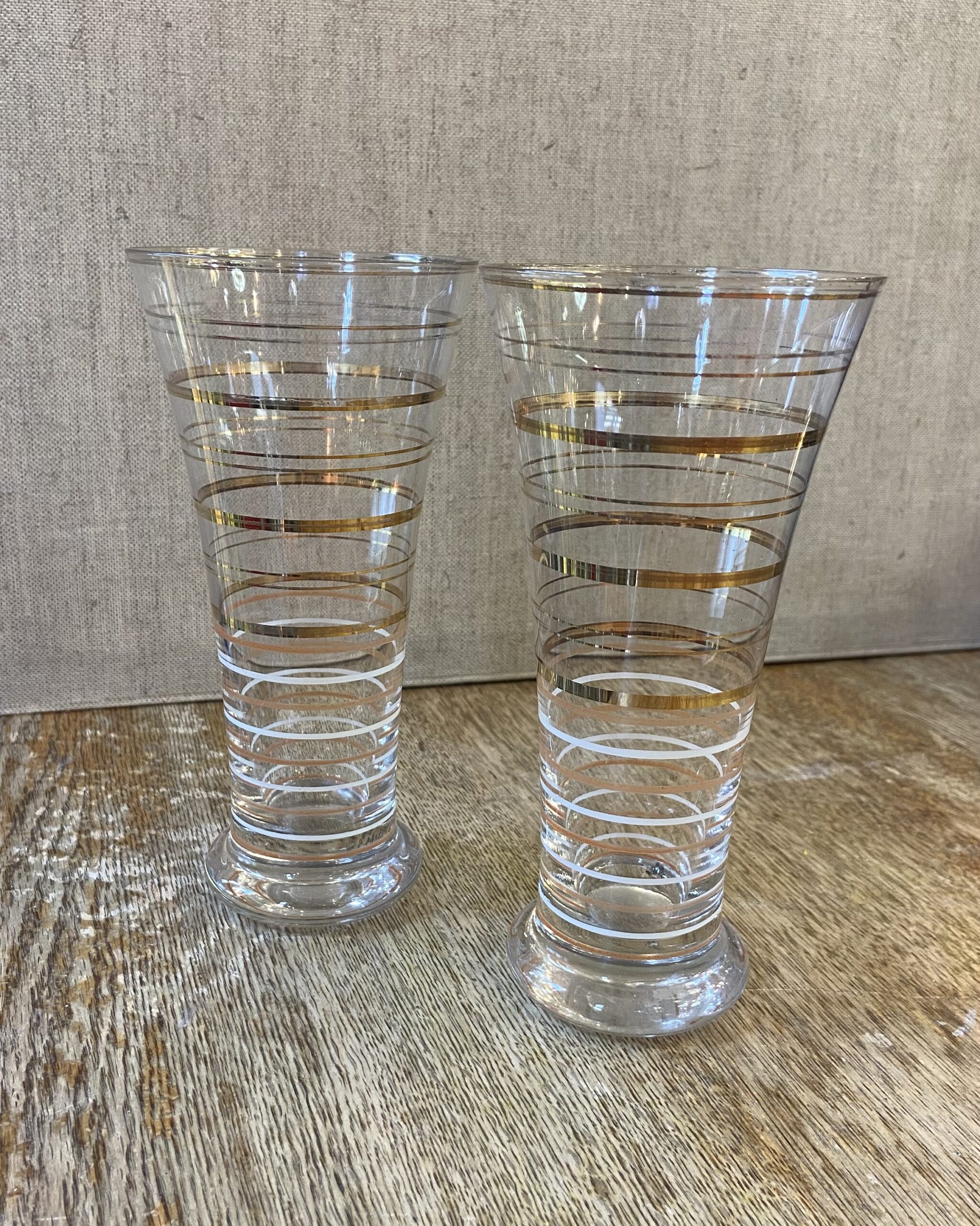This is a set of 2 mid century pilsner glasses, with gold stripped details around each glass.