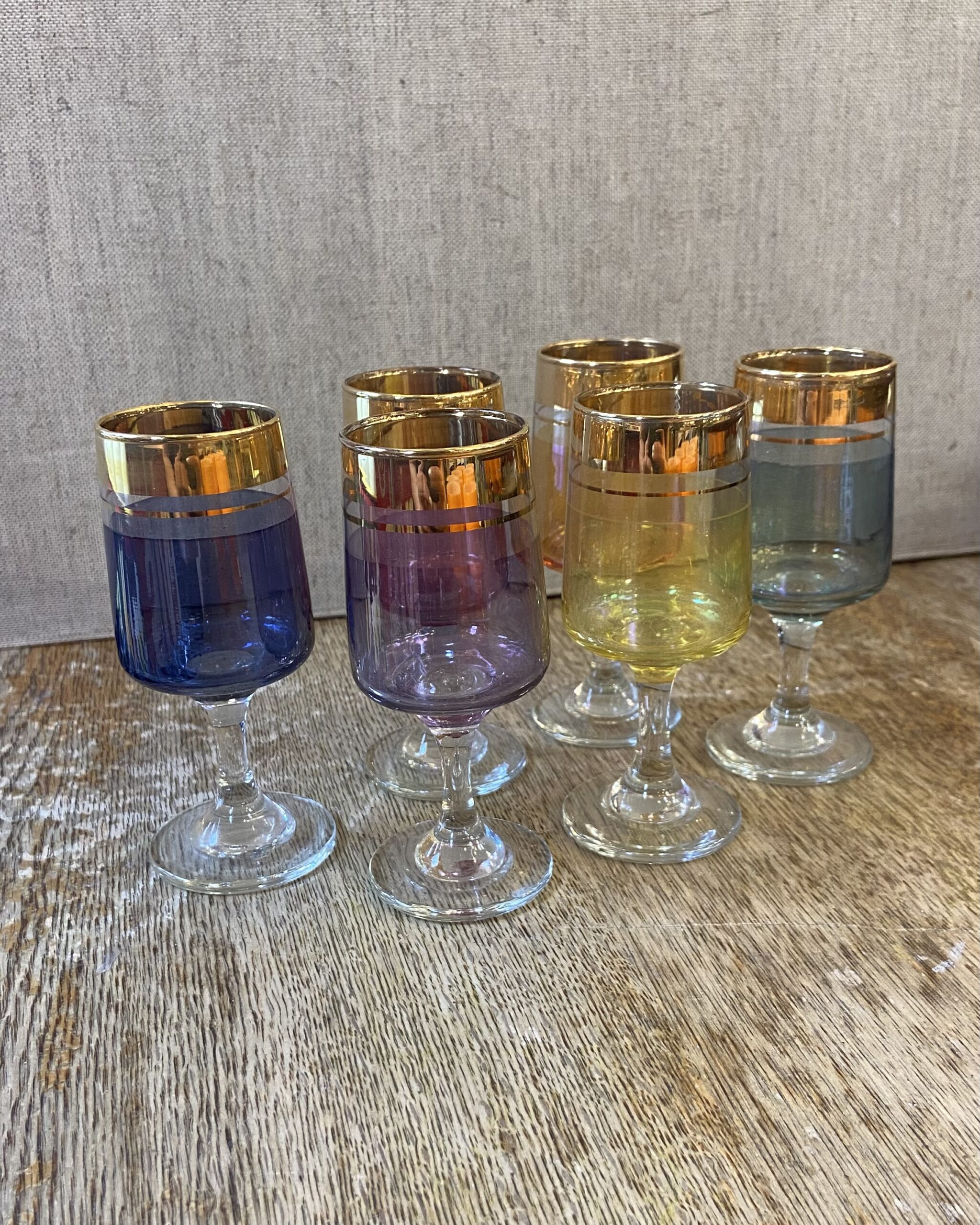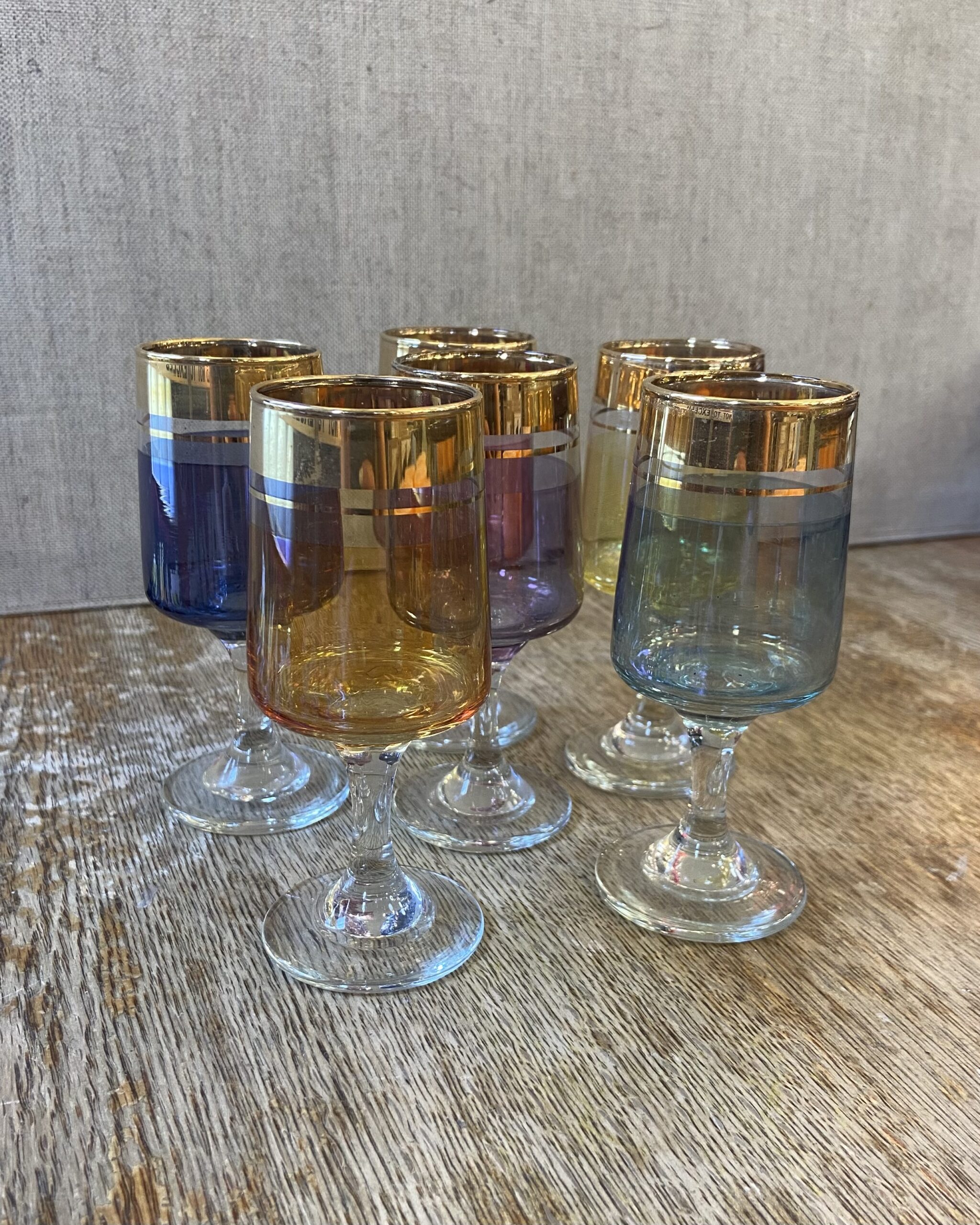 A beautiful set of 6 mid century stemmed port glasses, in pastel coloured glass with gold striped accents.