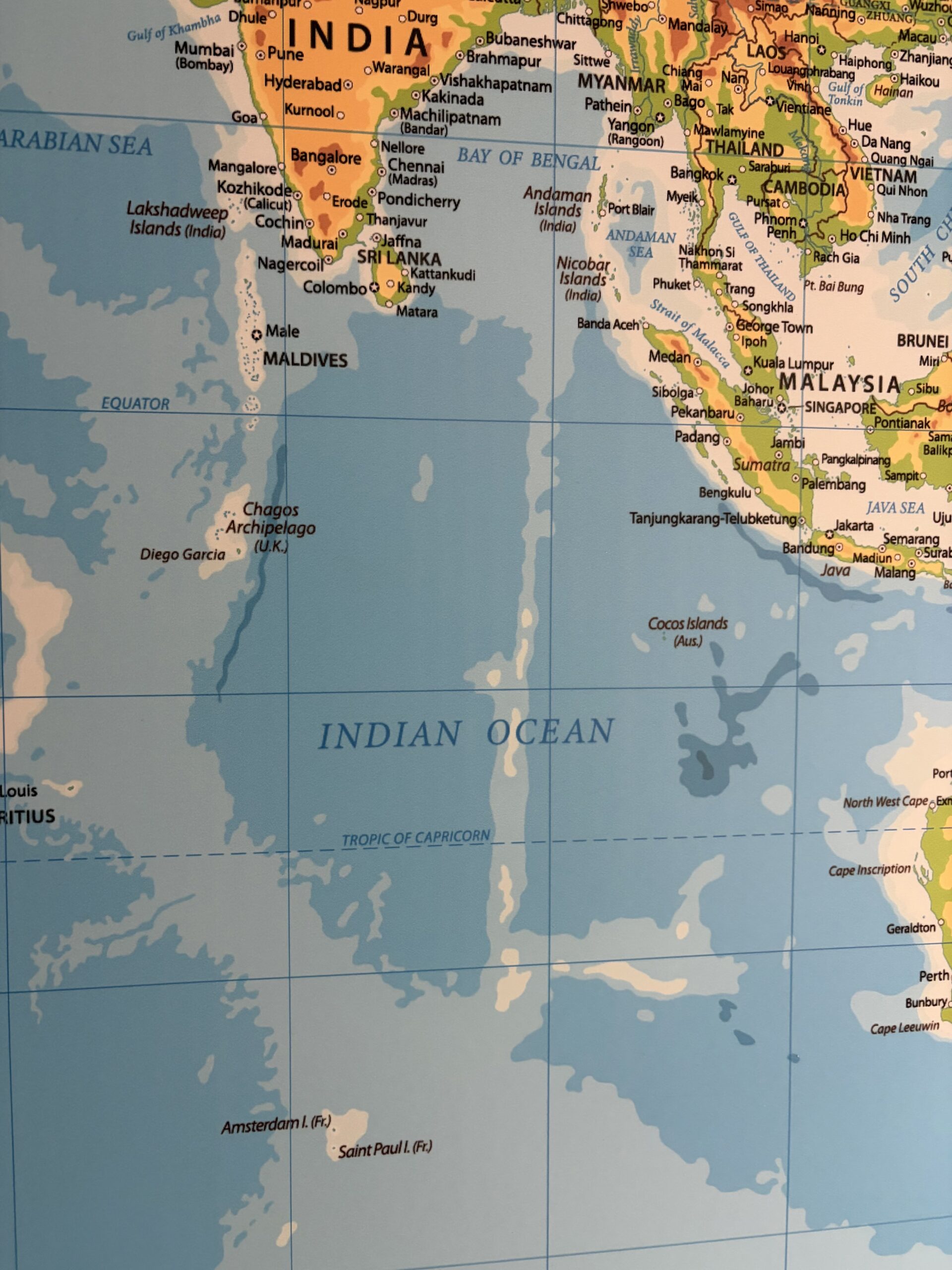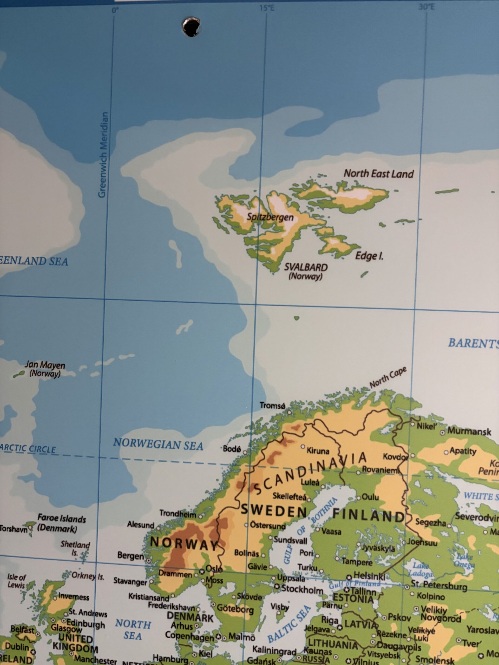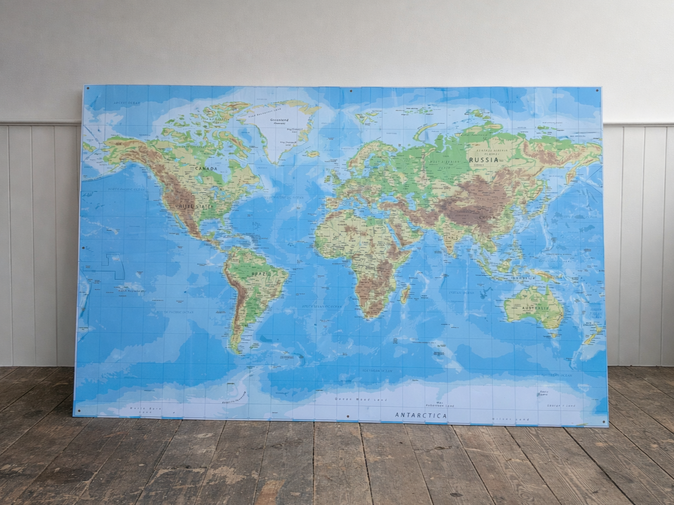This world map is printed onto a metal panel, making it an easy piece to display on a wall, with holes for easy hanging. Typically created for educational decoration in a school or office.