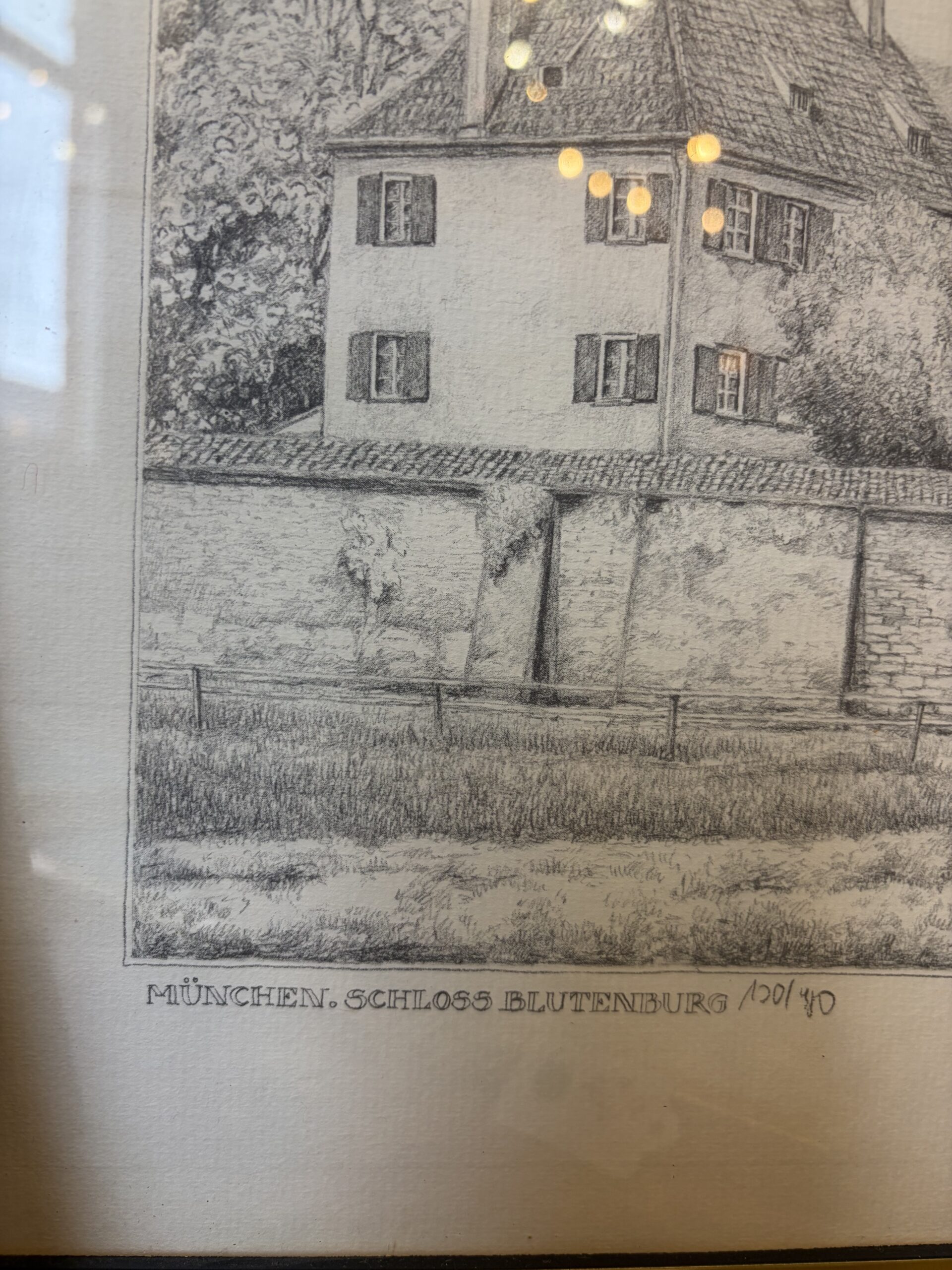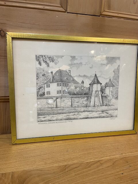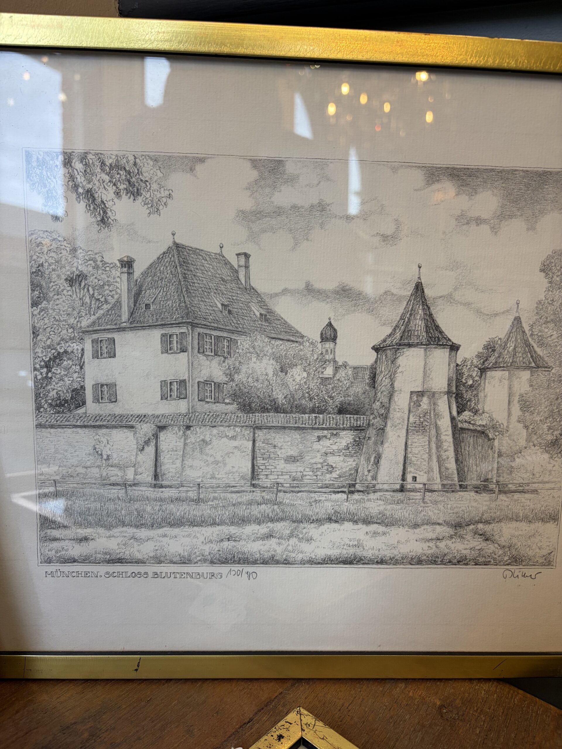 This is a limited edition print of Blutenburg Castle, framed in a gold metal frame.