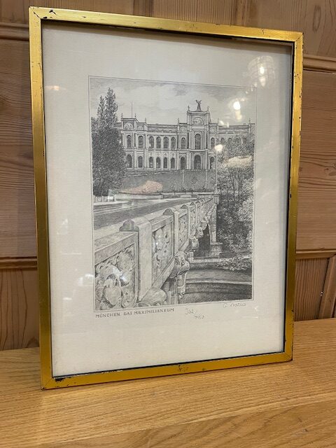 This is a limited edition print of the Maximilaneum Building in Germany, framed in a gold metal frame.