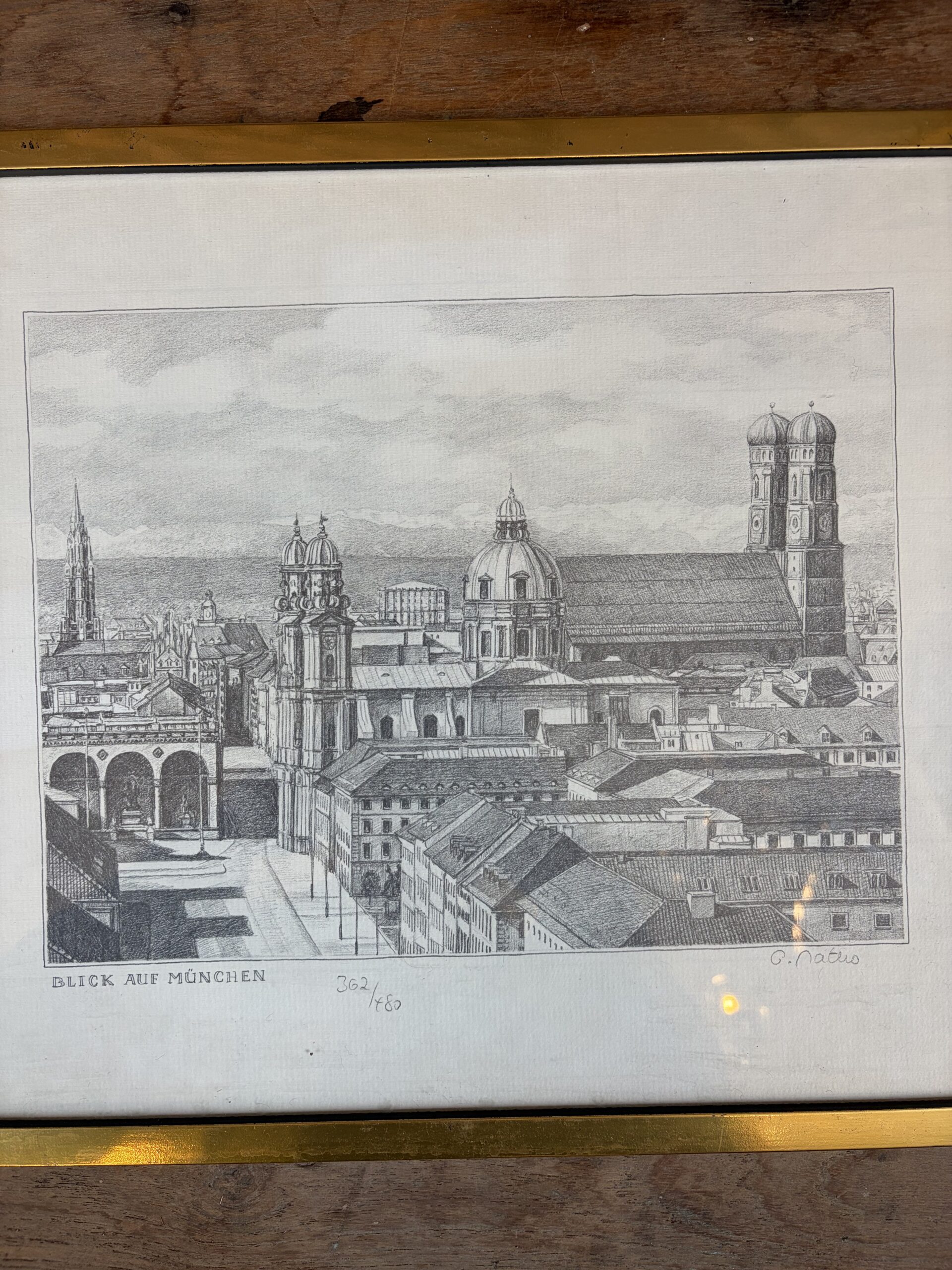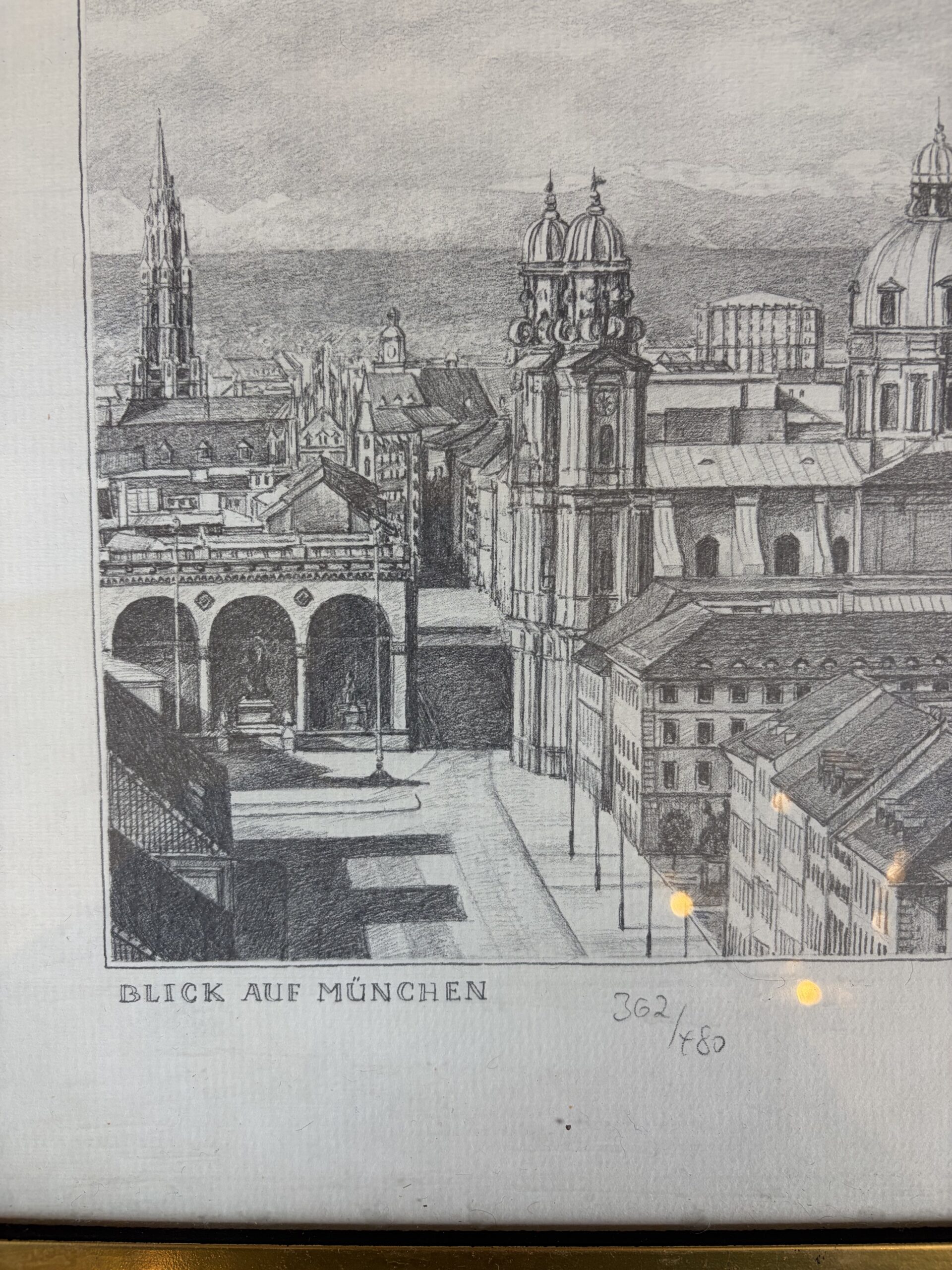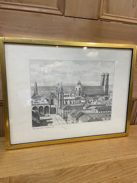 This is a limited edition etching print of a skyline view of Munich, with the text ‘BLICK AUF MUNCHEN’ at the bottom left. This German phrase translates to “View of Munich”. Framed in a gold metal frame.