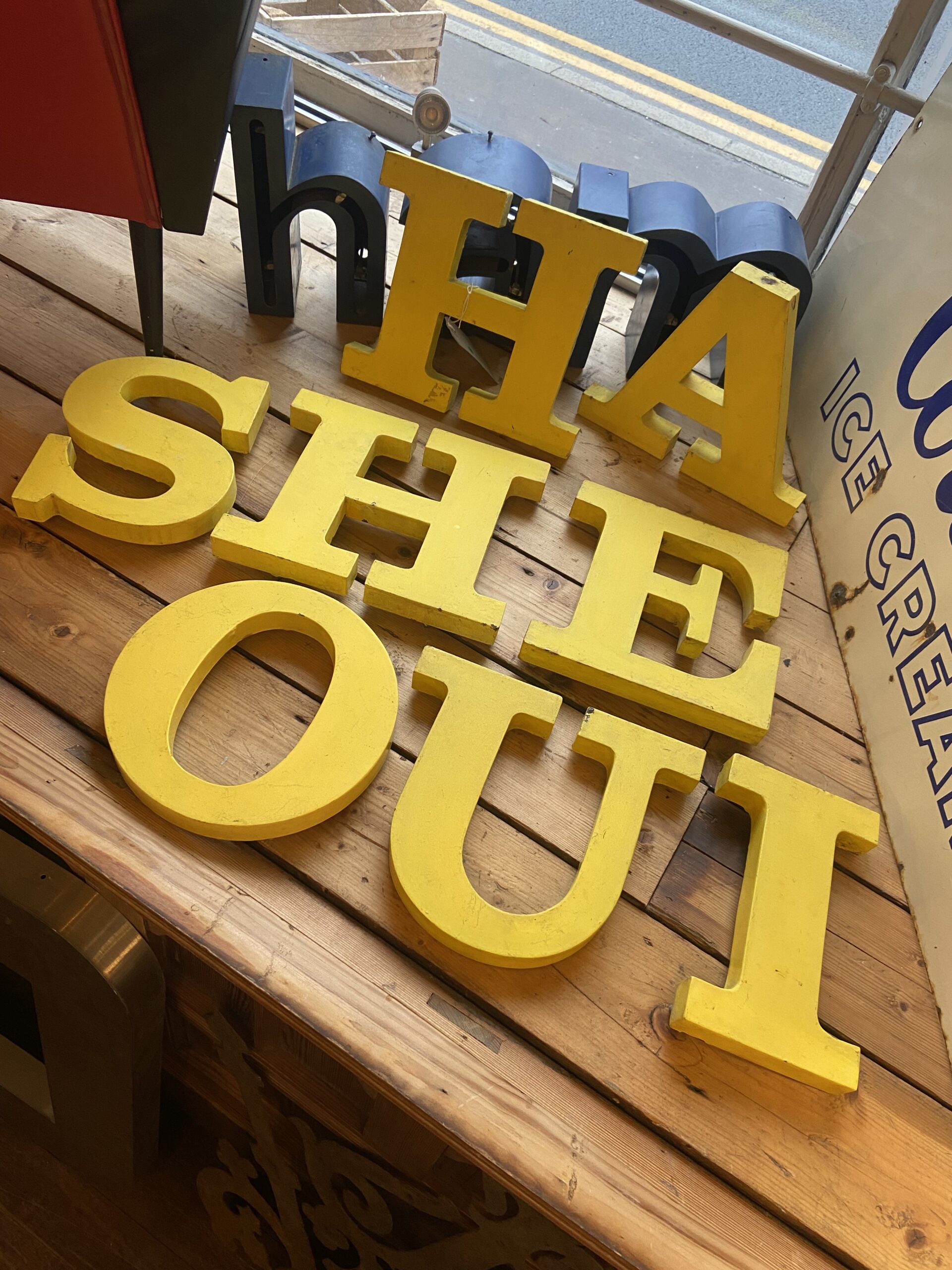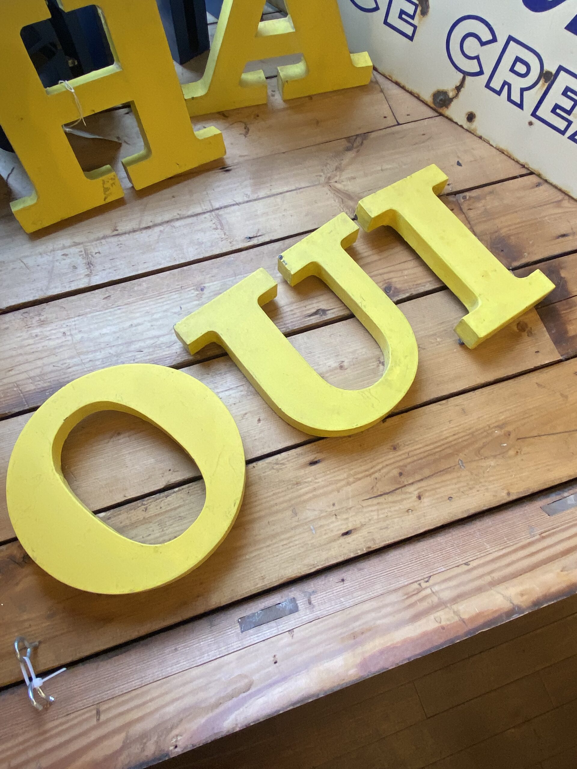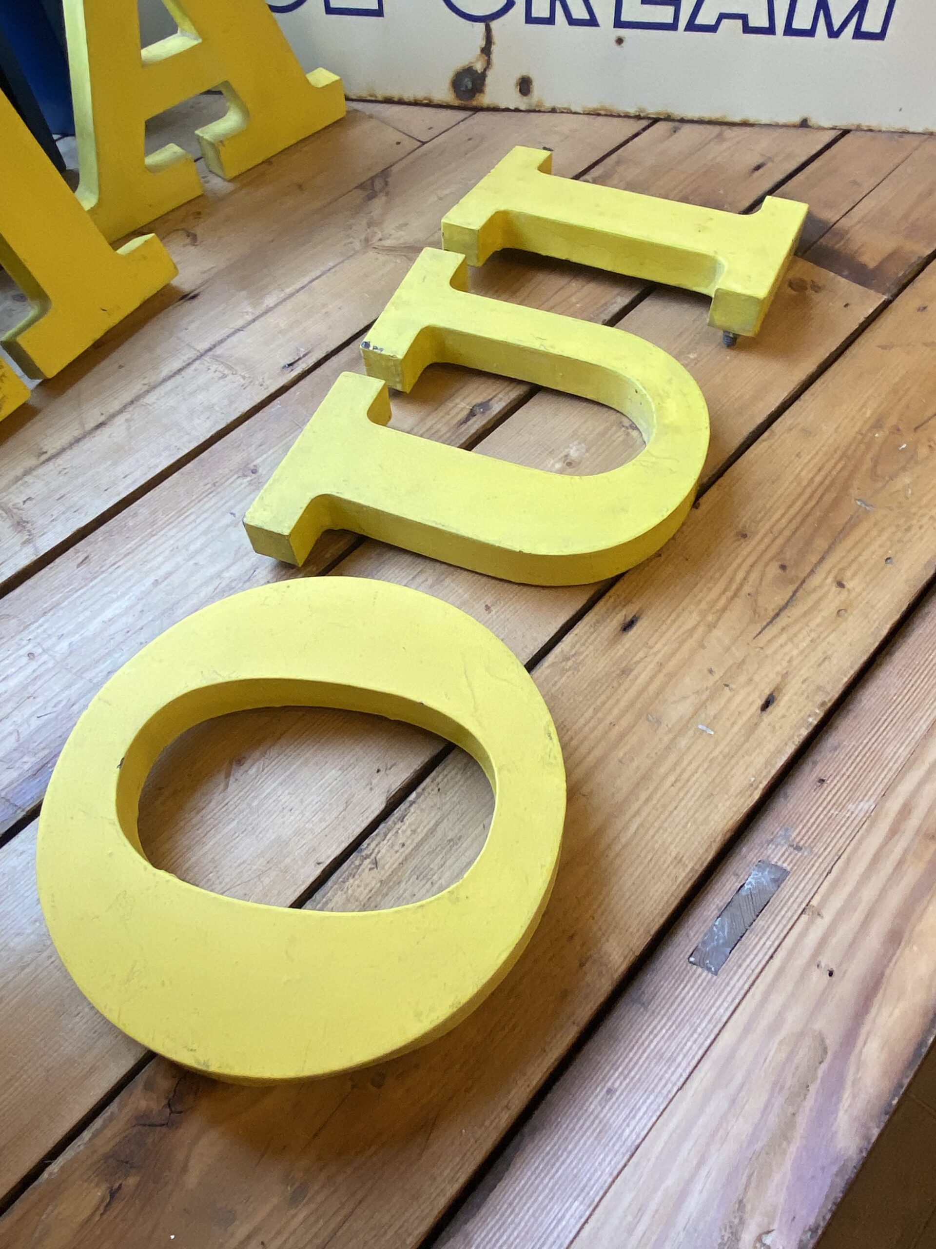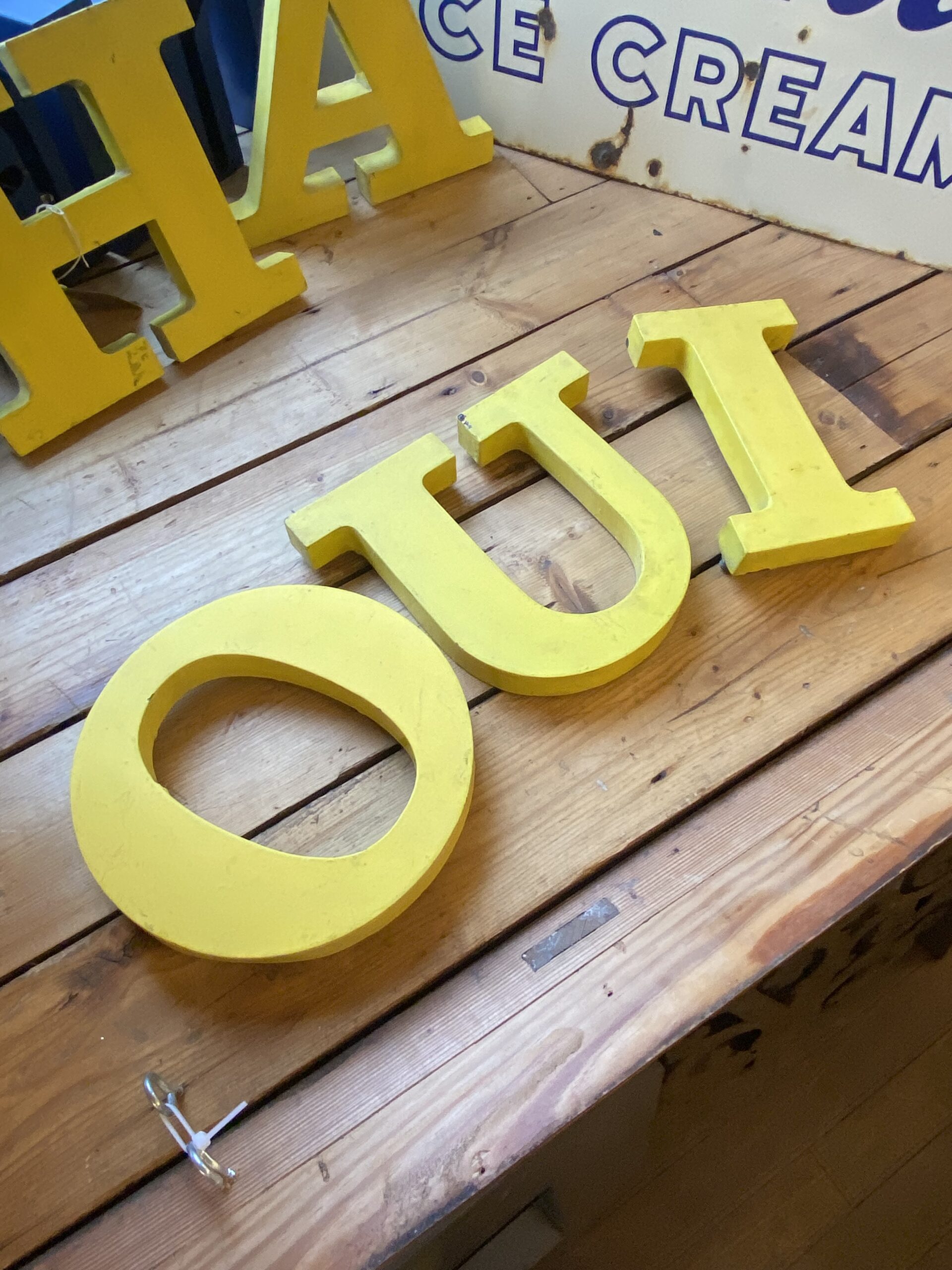 Large, vintage metal letters in a bold, serif font. Painted in yellow with an aged patina.