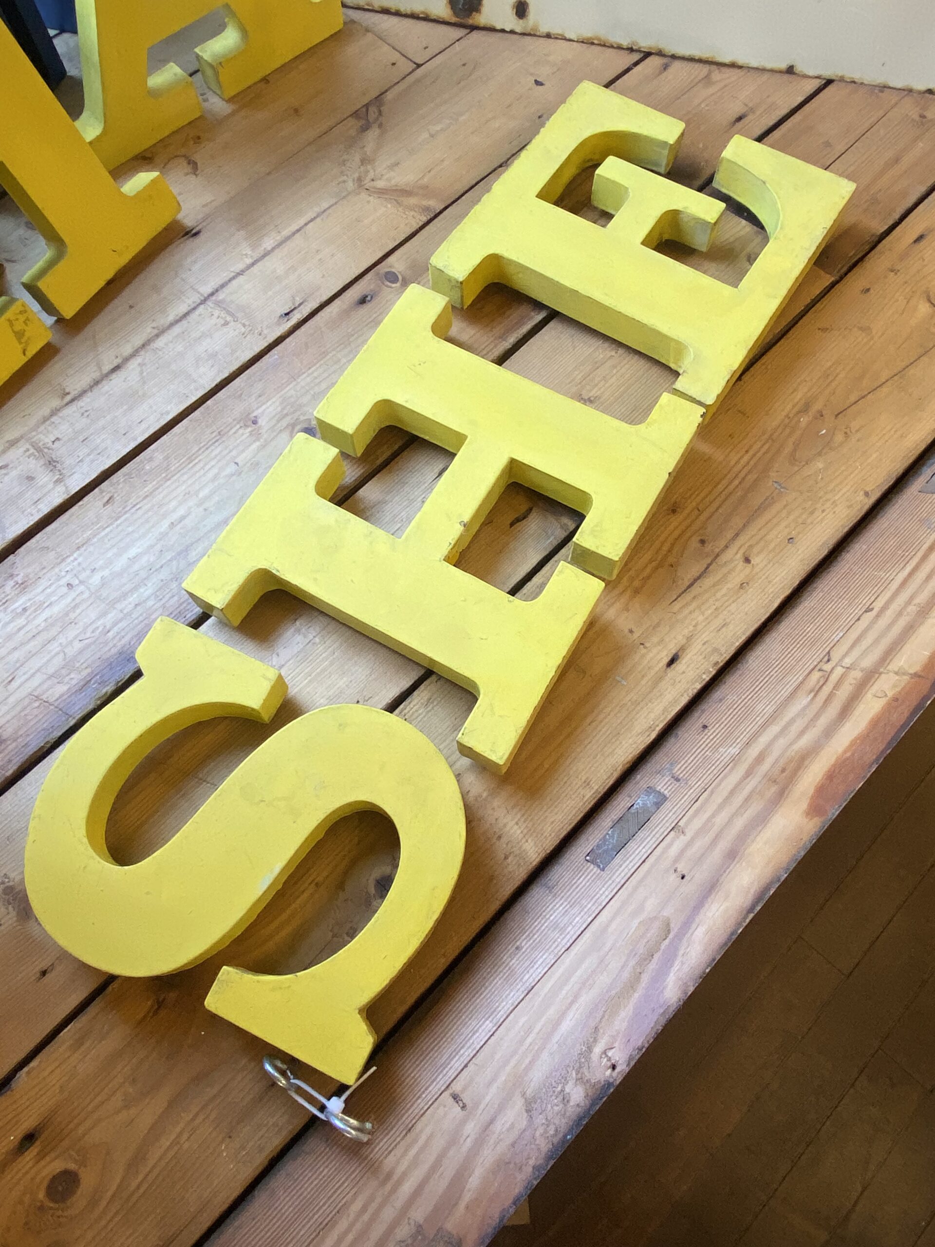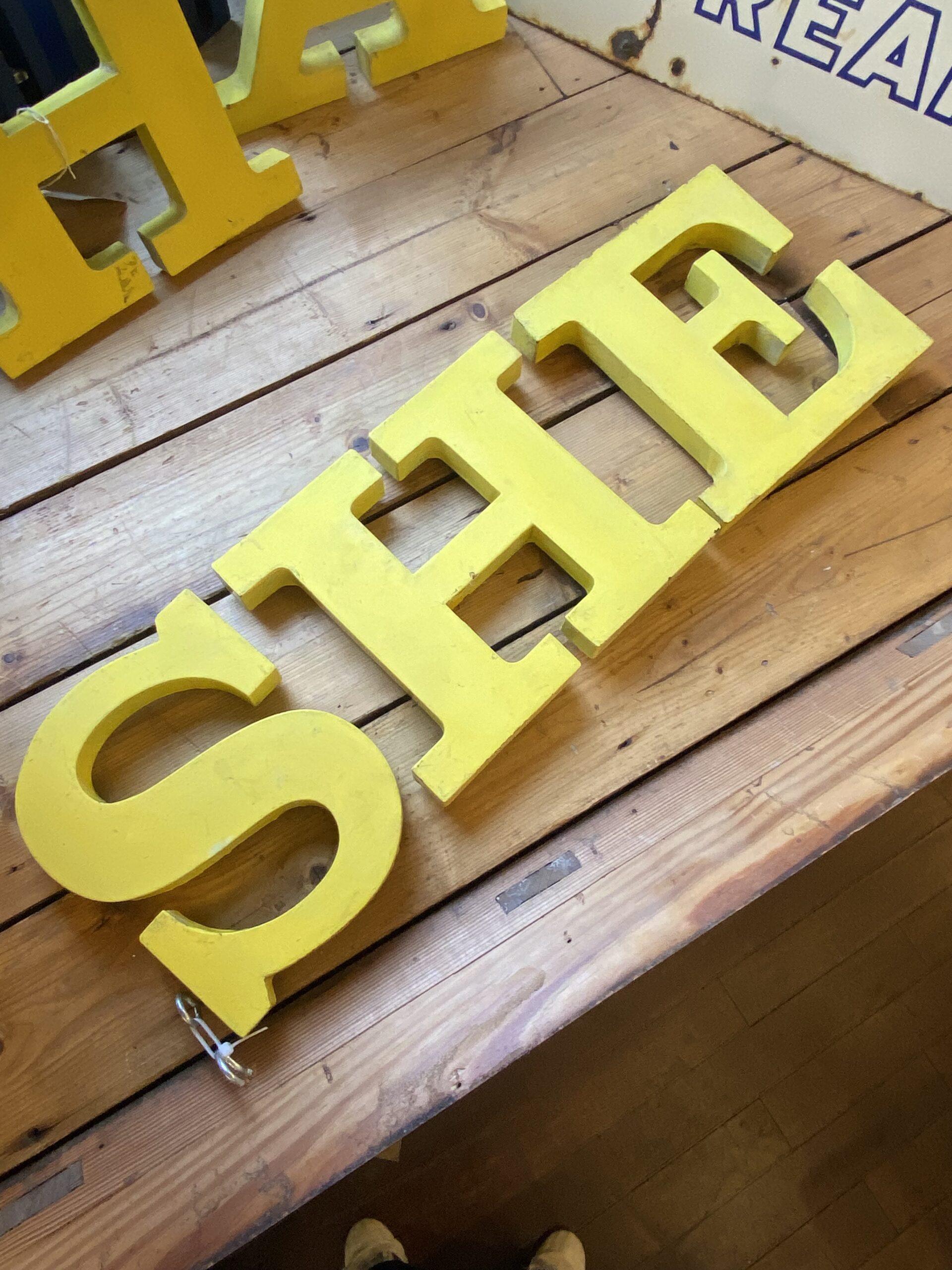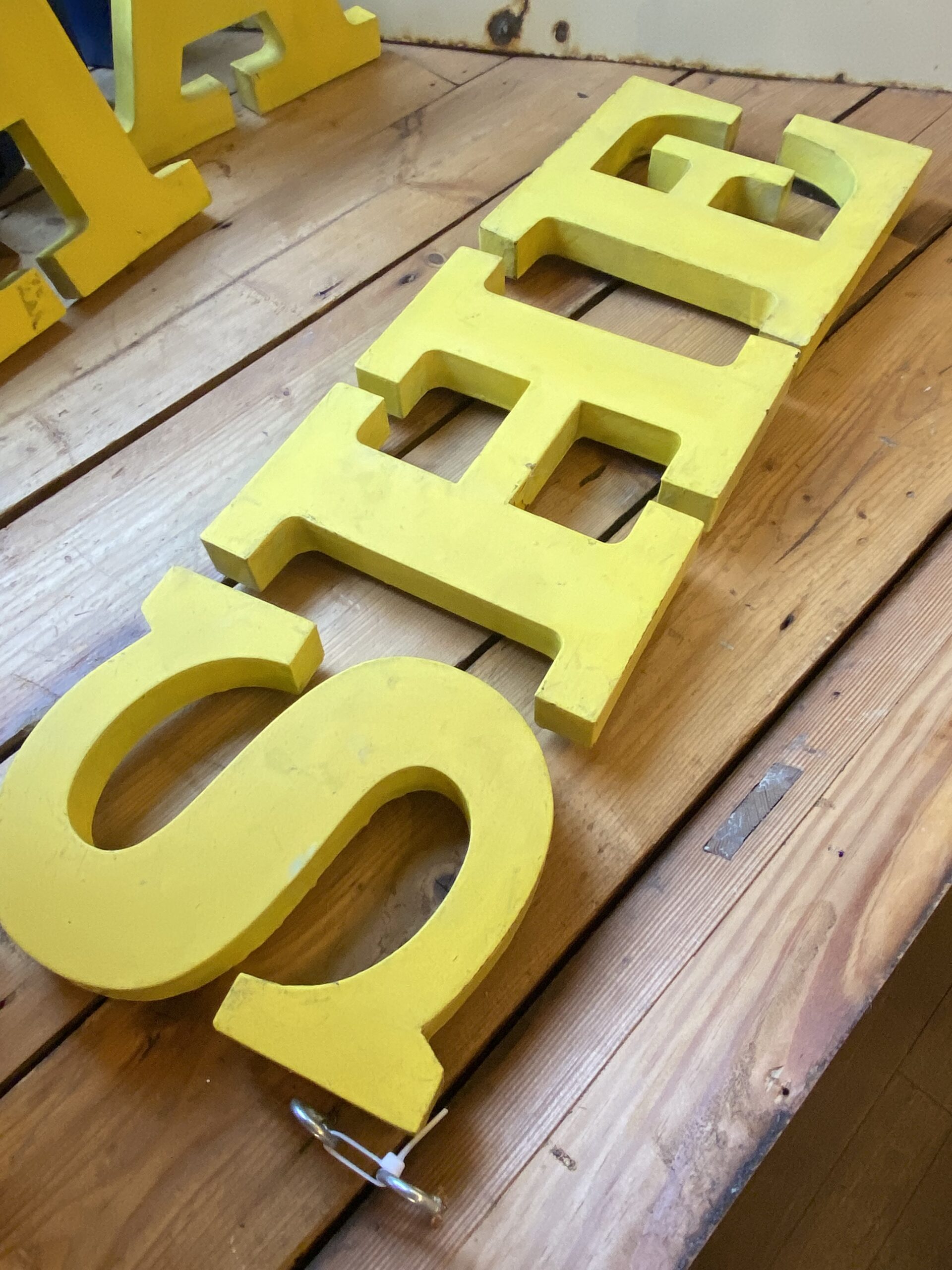 Large, vintage metal letters in a bold, serif font, spelling ‘SHE’. Painted in yellow with an aged patina.