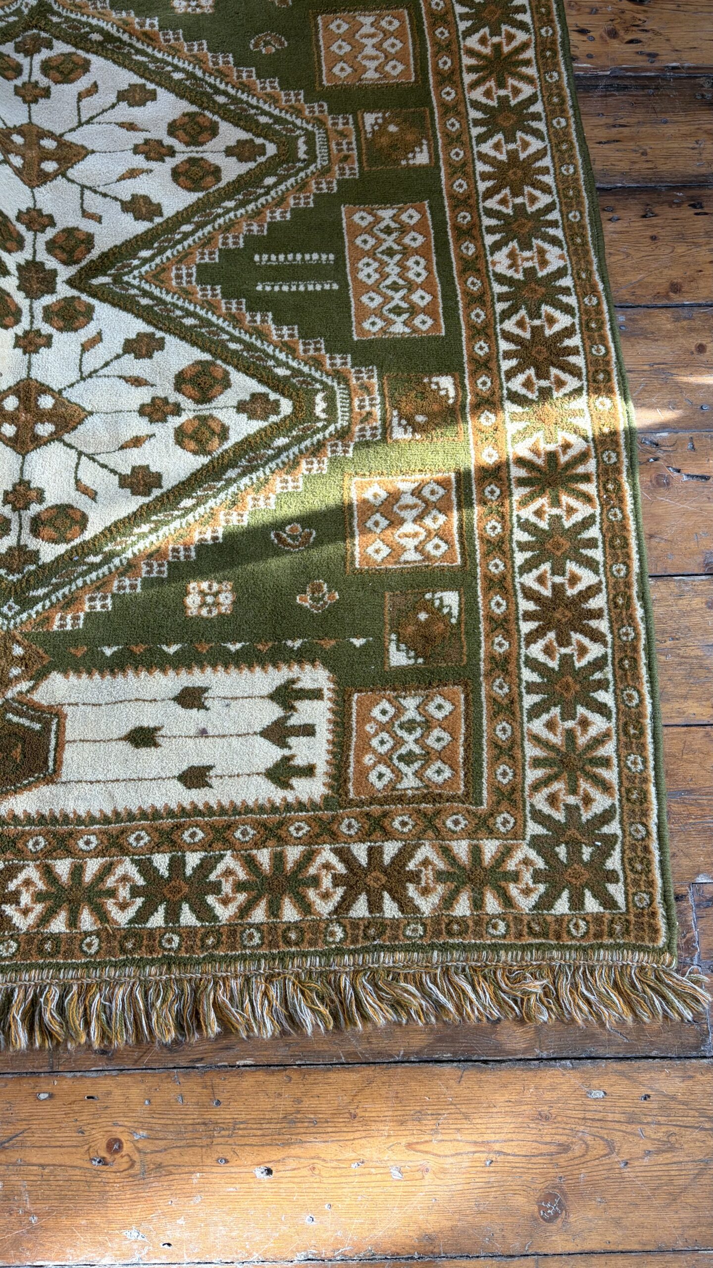 This is a beautiful, vintage wool rug, featuring geometric patterns in a Turkish style. In earthy tones including olive green, rustic brown and beige.