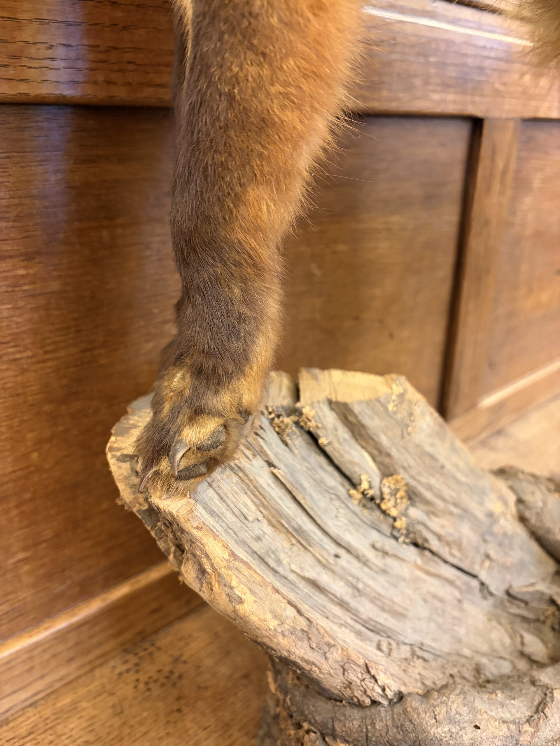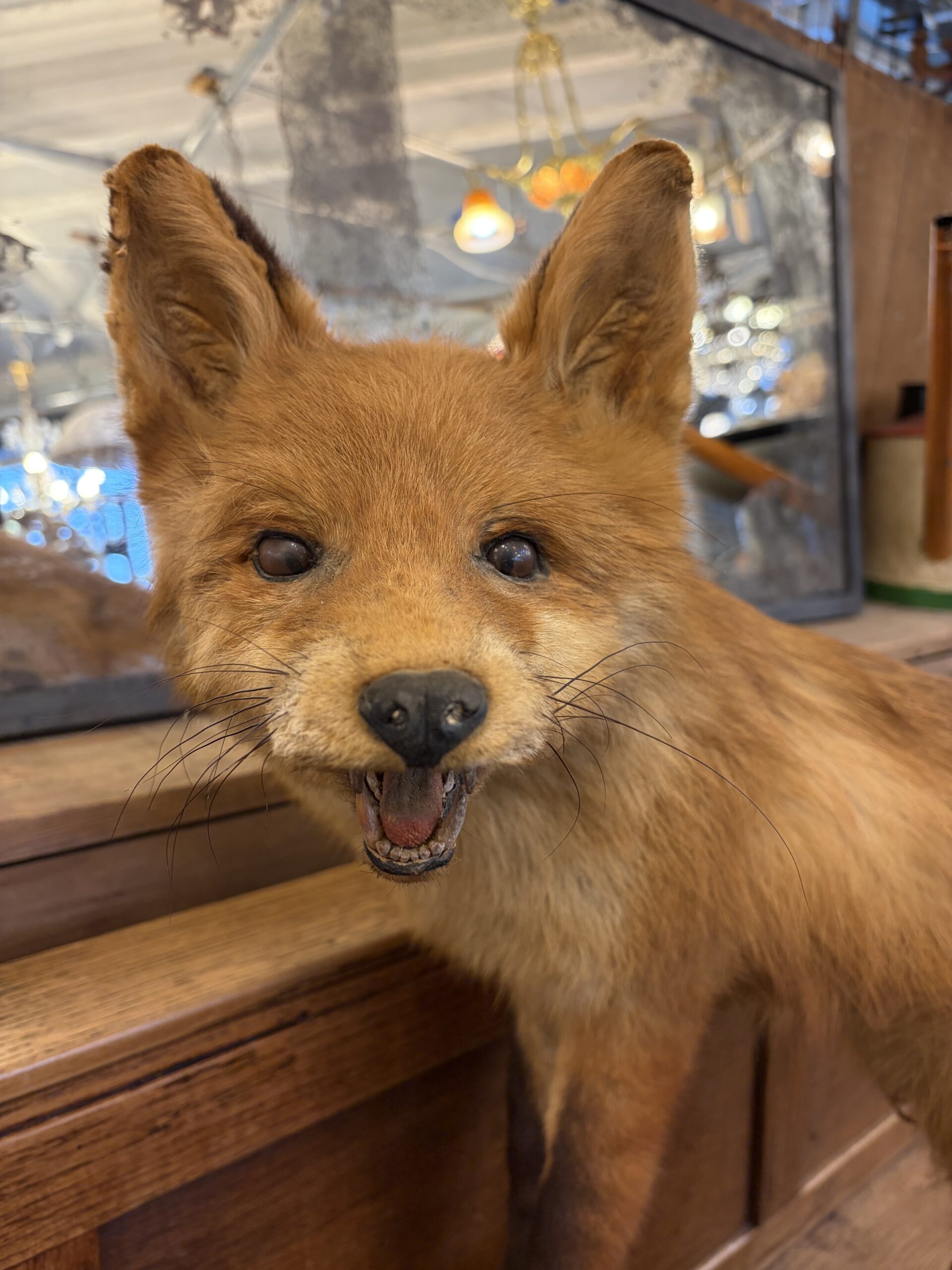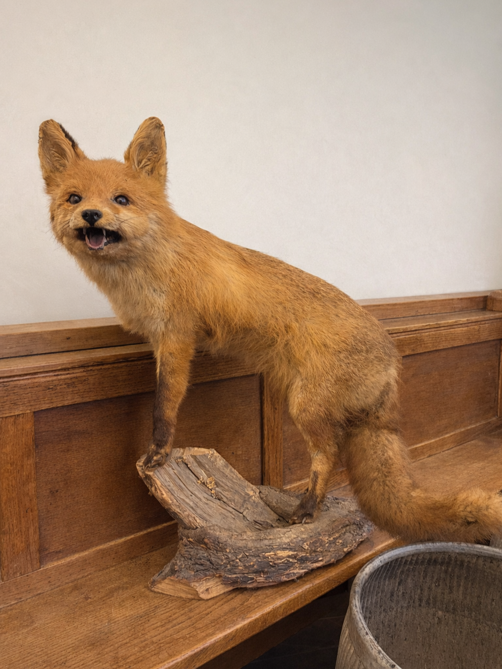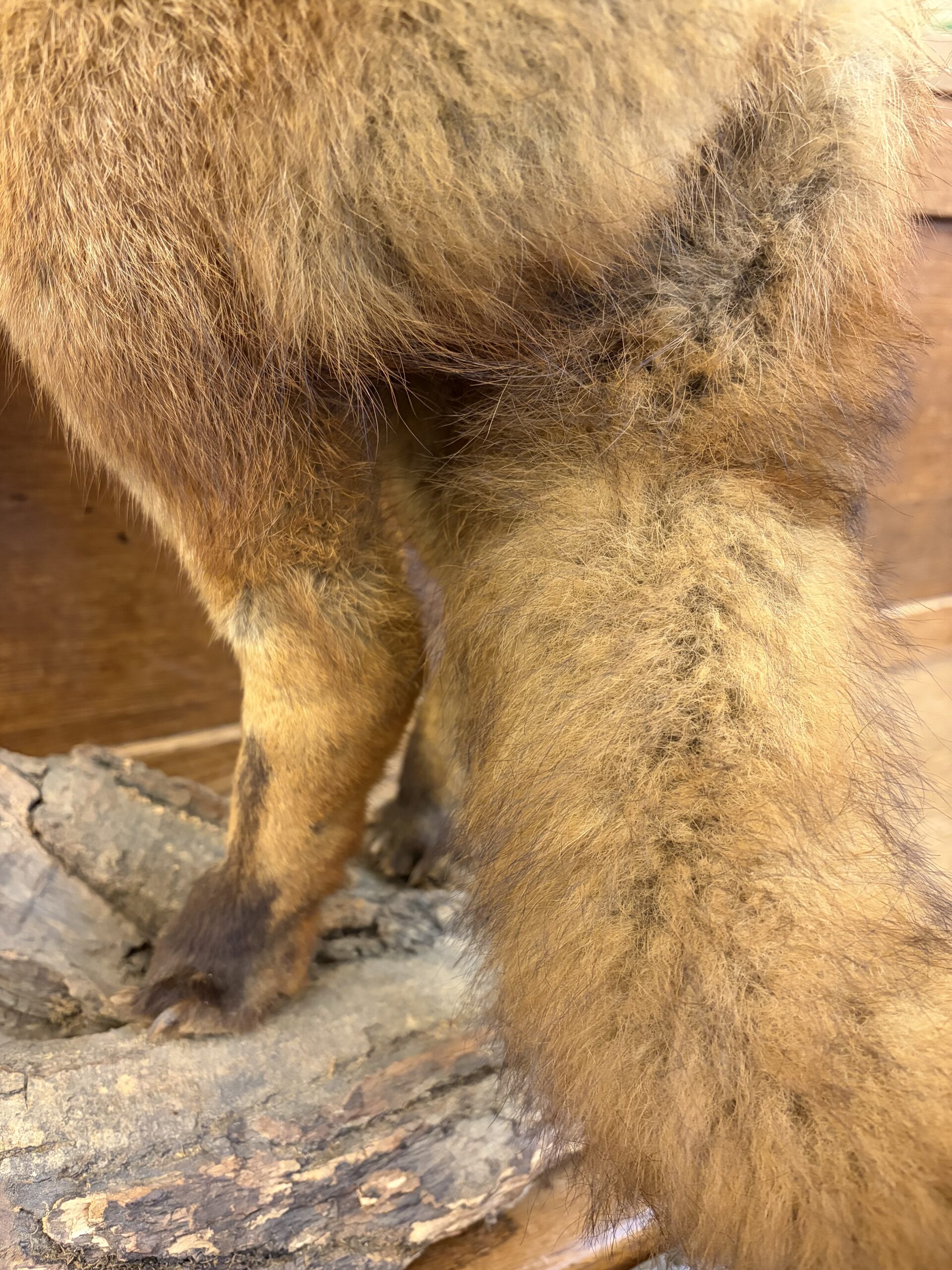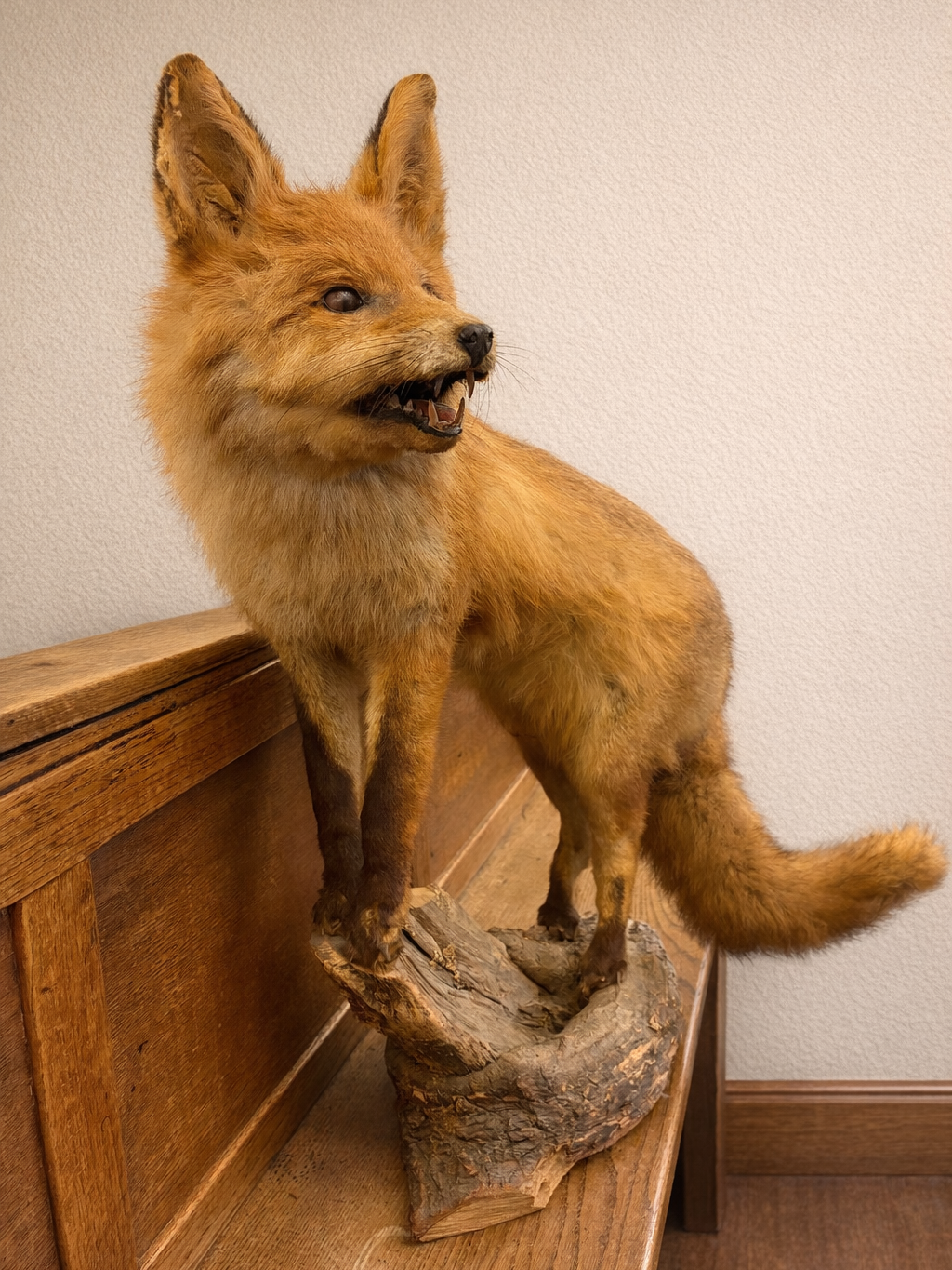 This is a vintage full-mount red fox (Vulpes vulpes). This taxidermy specimen is presented in a dynamic, upright pose on a natural weathered wood base. The fox’s head is turned with its mouth open, a common feature in vintage and antique mounts to suggest character.