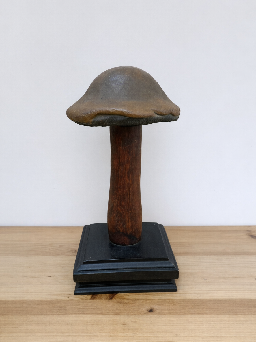 This is a Mushroom Sculpture on a decorative square black stand. Featuring a painted finish with a slight metallic underneath. An interesting, decorative home accessory to bring a whimsical or forest-themed accent to a room.