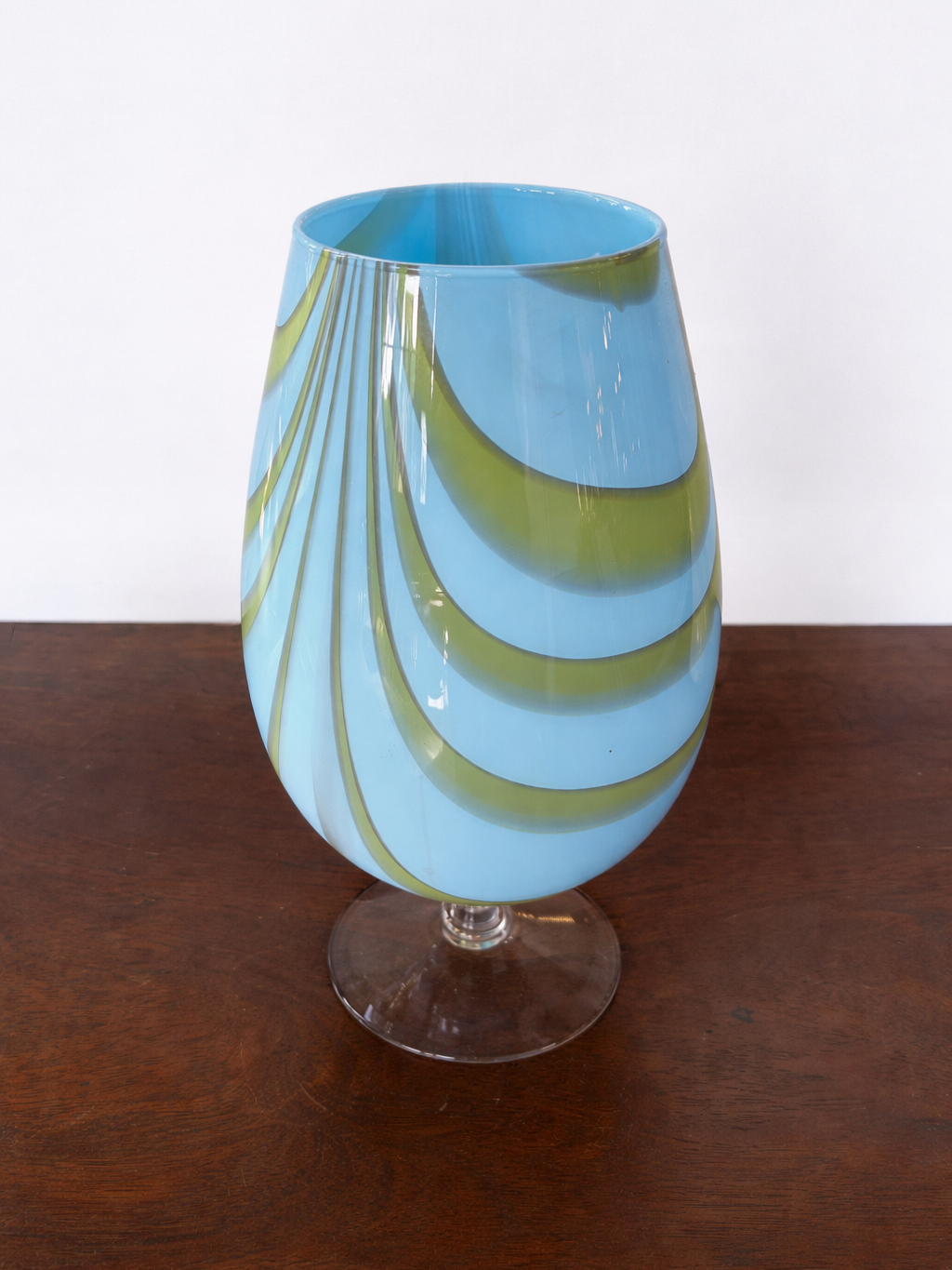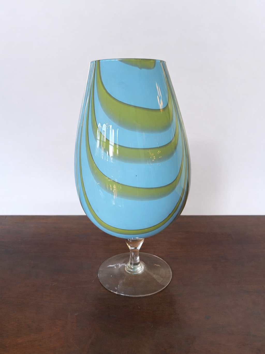 The is a beautiful, vintage hand-blown studio art glass vase featuring a distinctive light blue and green swirled “candy stripe” pattern. A typical style of mid-century modern “Space Age” glass design, circa 1970s.
