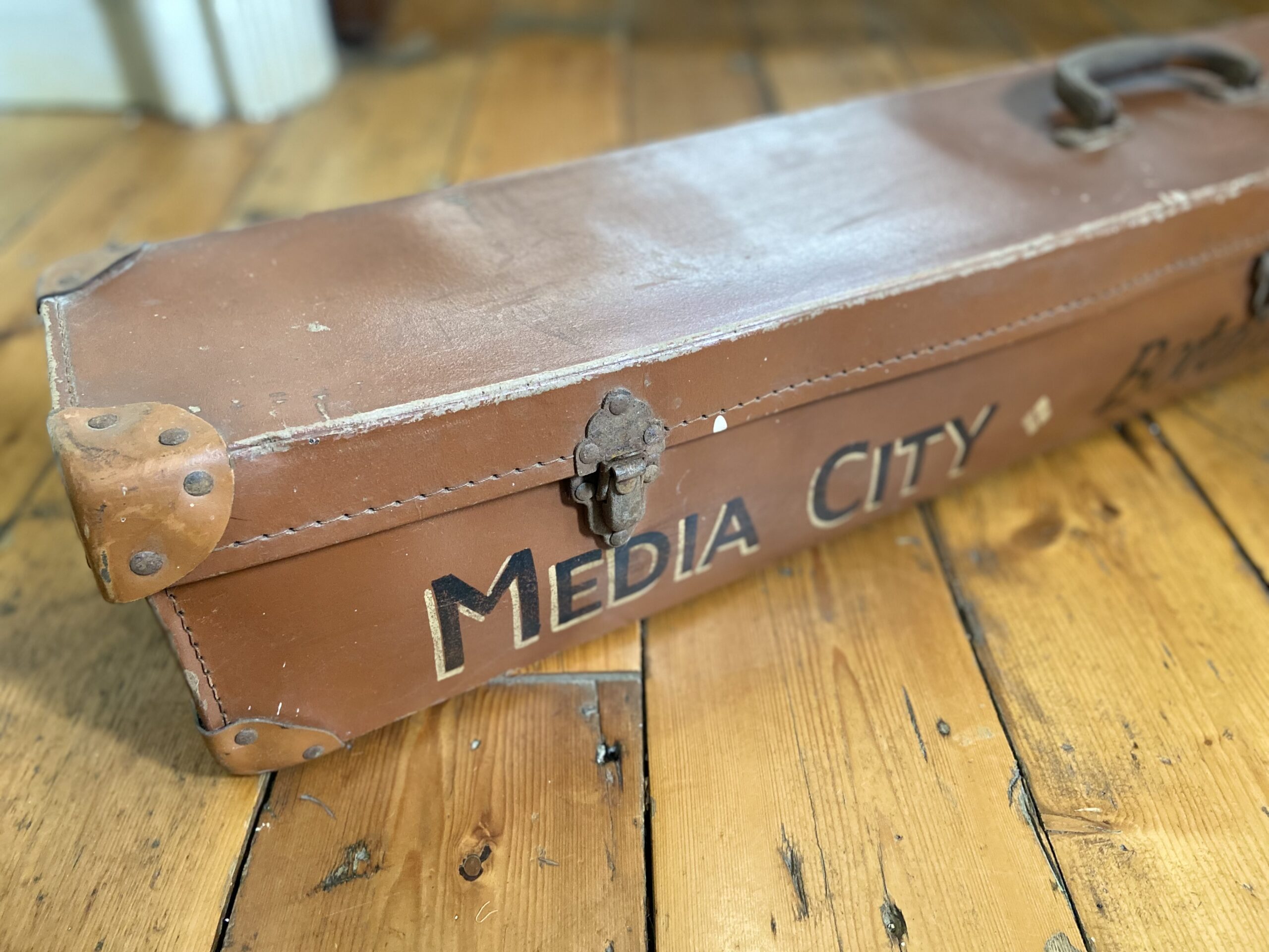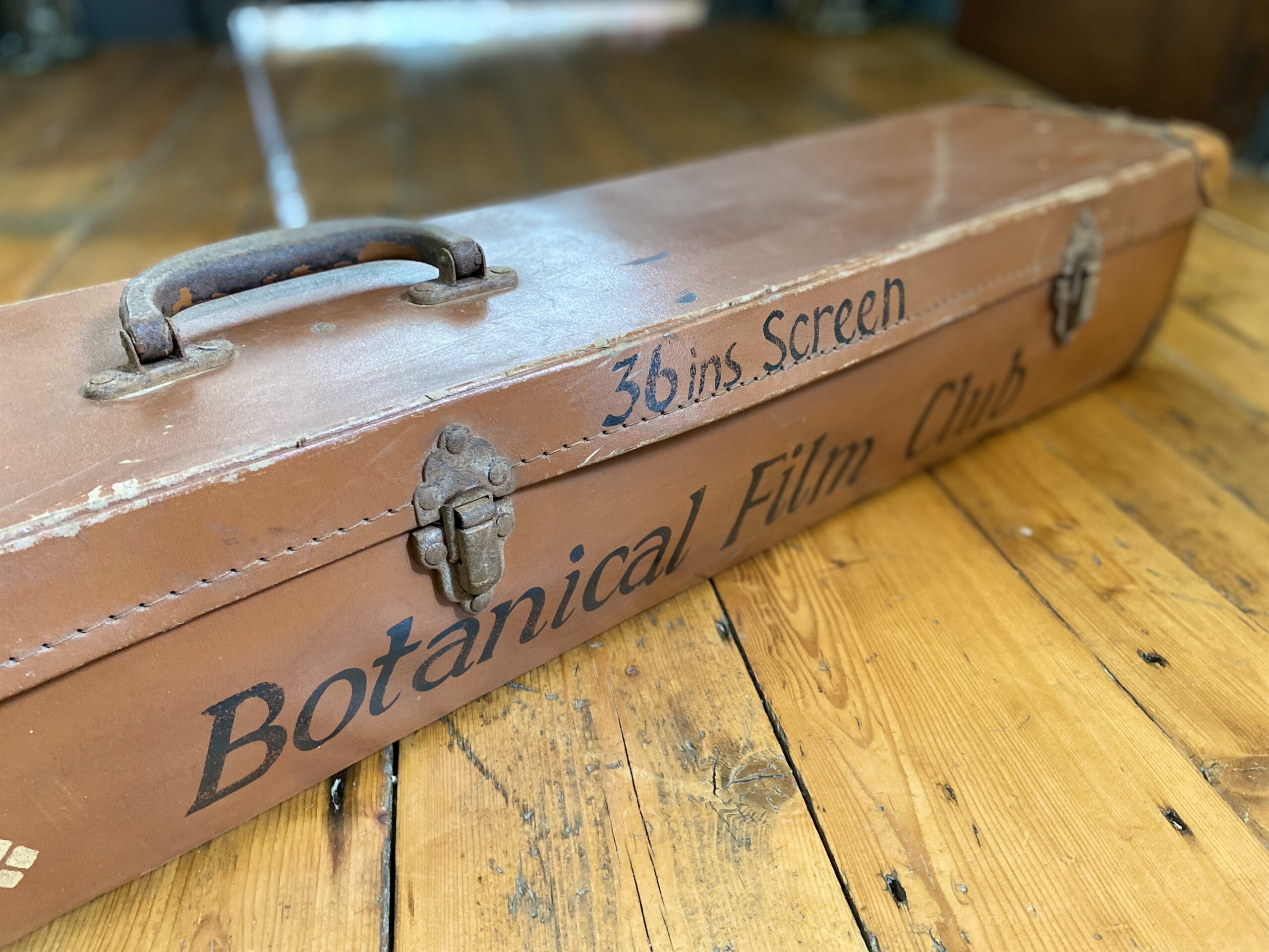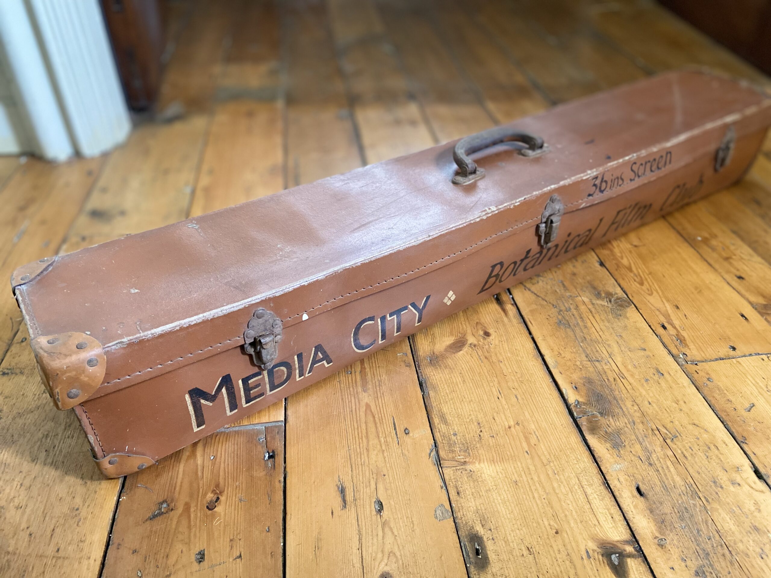 A mid-century case for a 36″ projection screen, featuring hand-painted lettering; “Media City. Botanical Film Club”. Leatherette-covered with metal latches, reinforced corners, and carry handle.