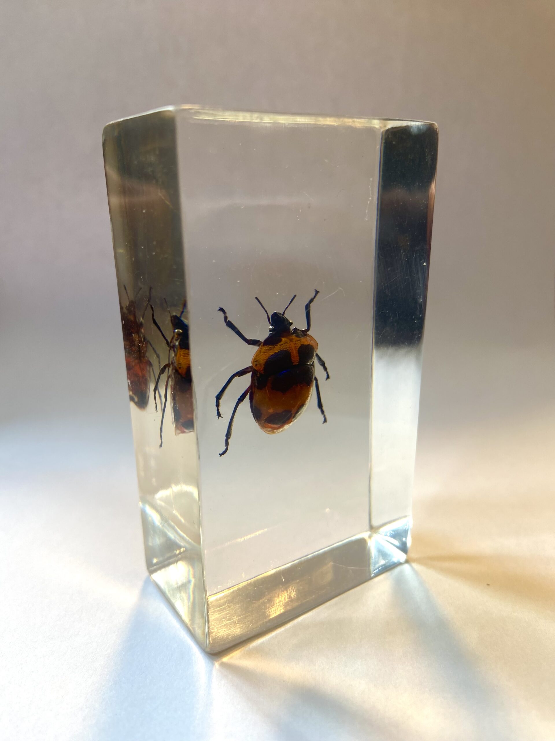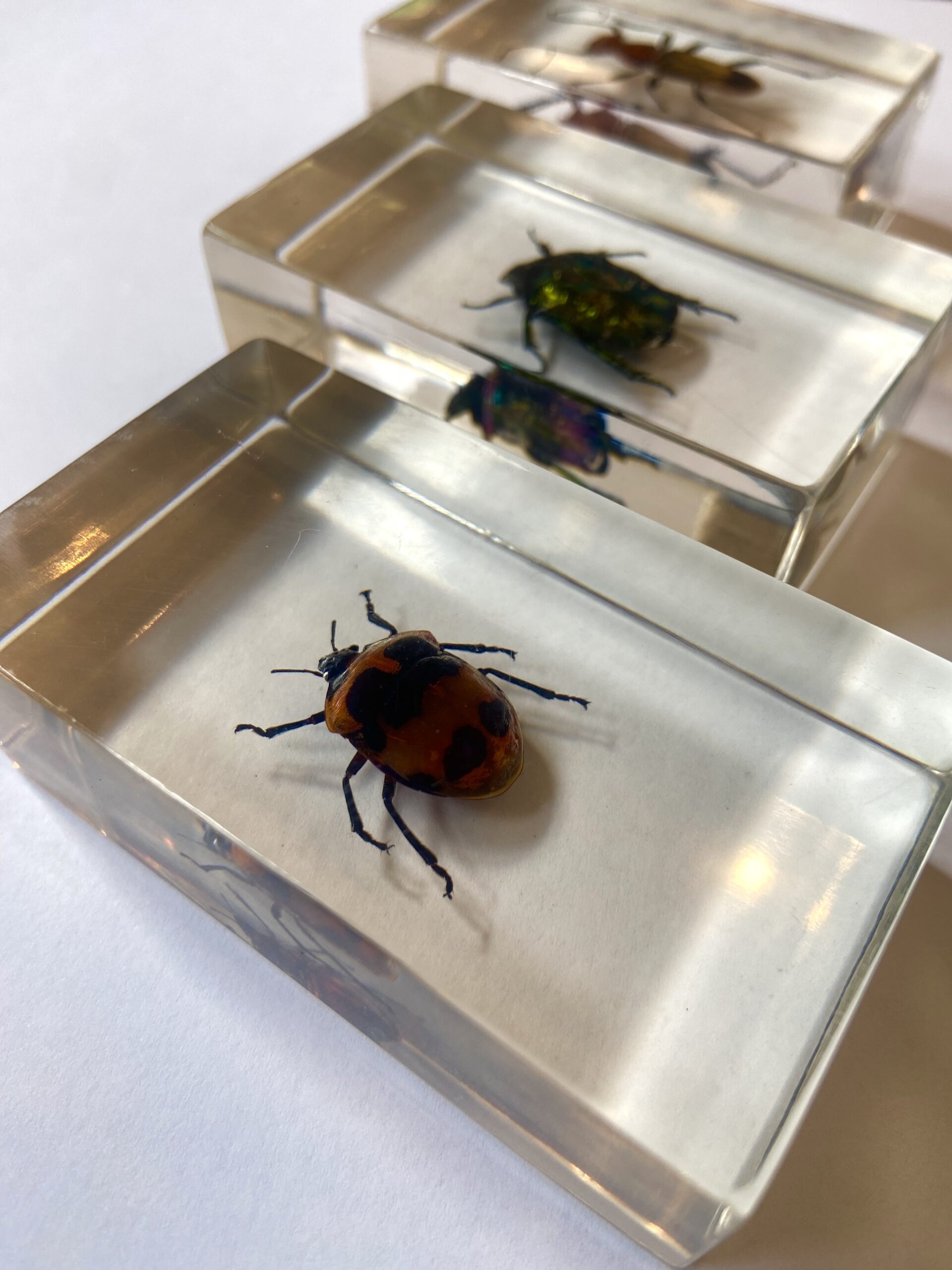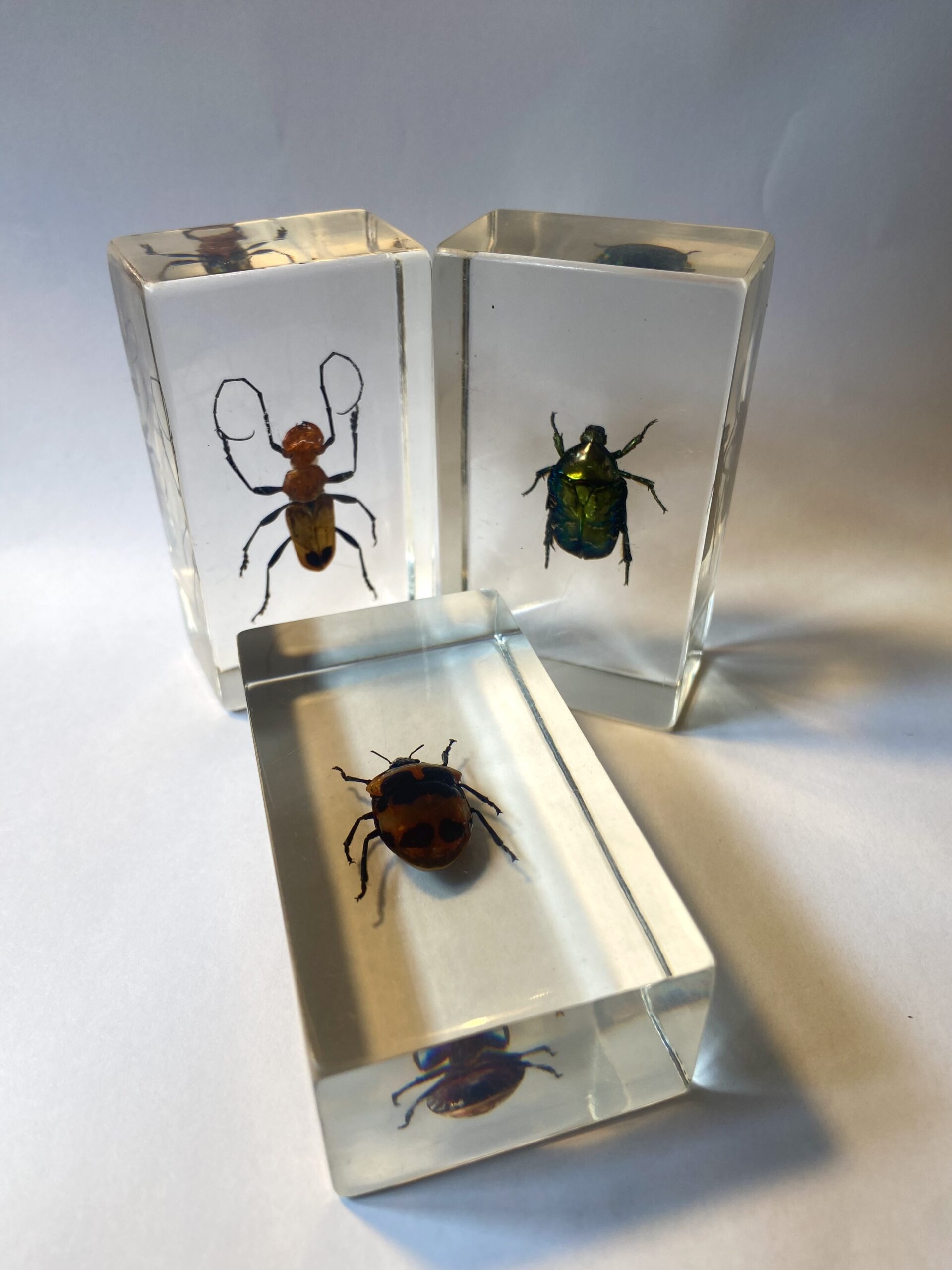 A collection of different insects preserved in resin. many different types of insects, from beetles to scorpions. Truly fascinating, one-off pieces.