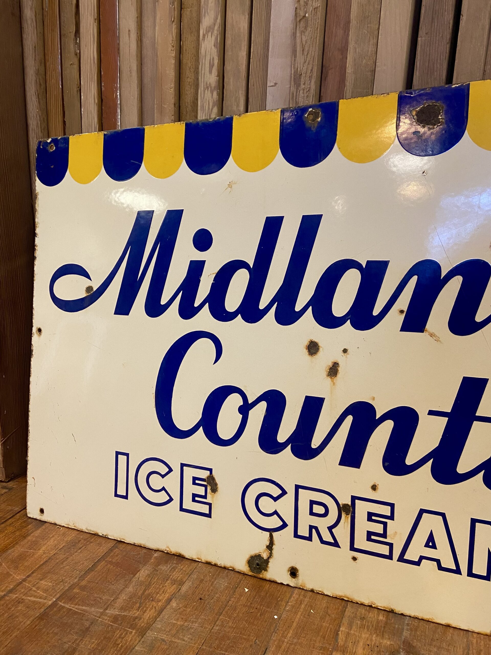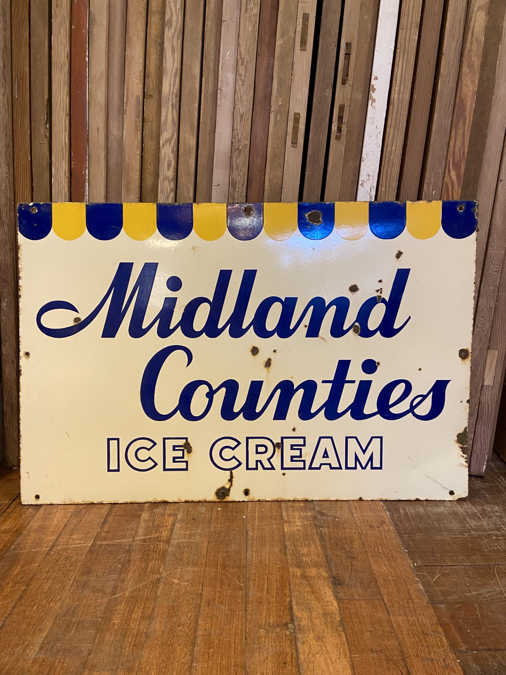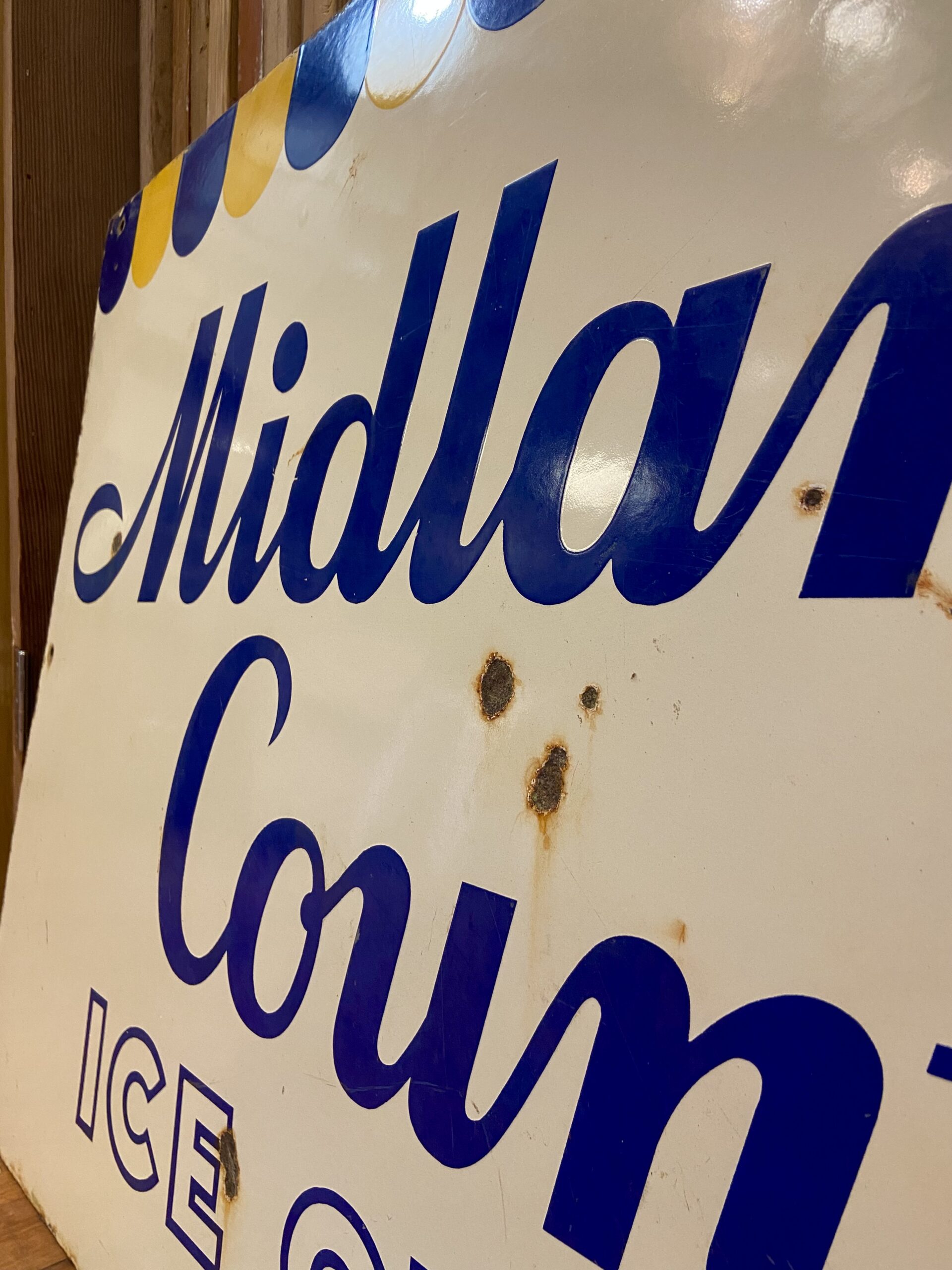 This Midland Counties ice cream sign shows the age in the worn rust spots, which only adds to the vintage look. The sturdy sign is made from metal, with enamel front in blue, yellow and cream colours. With corner holes for easy hanging, this is a fun piece of history.